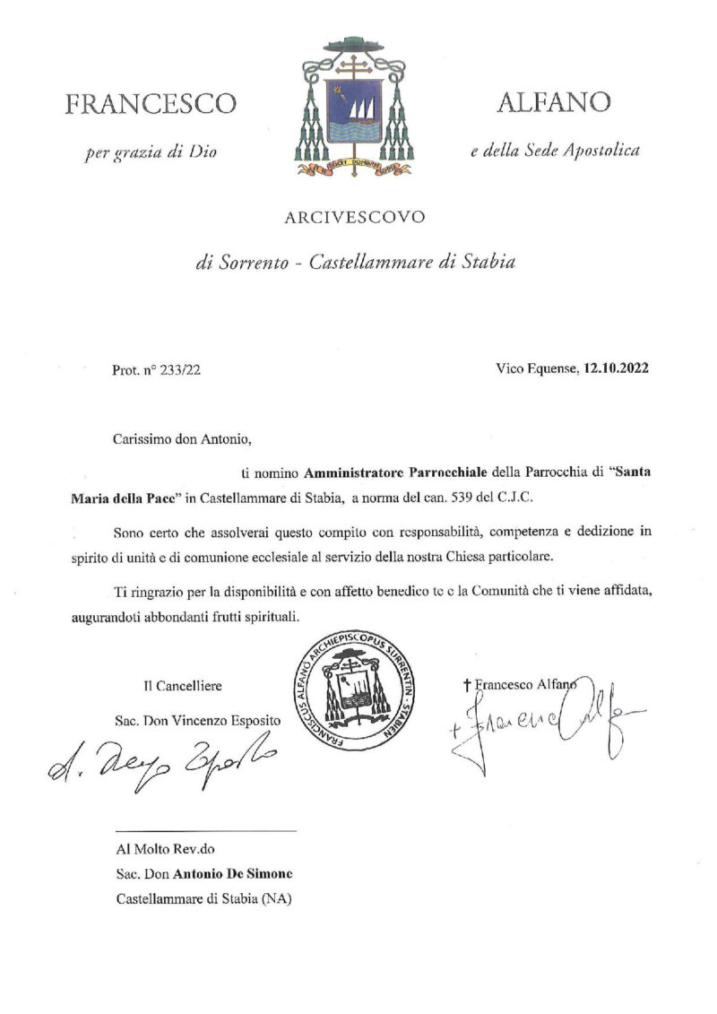Don Antonio De Simonme, in data 12 ottobre 2022, è stato nominato Amministratore Parrocchiale della parrocchia Santa Maria della Pace, Castellammare di Stabia.