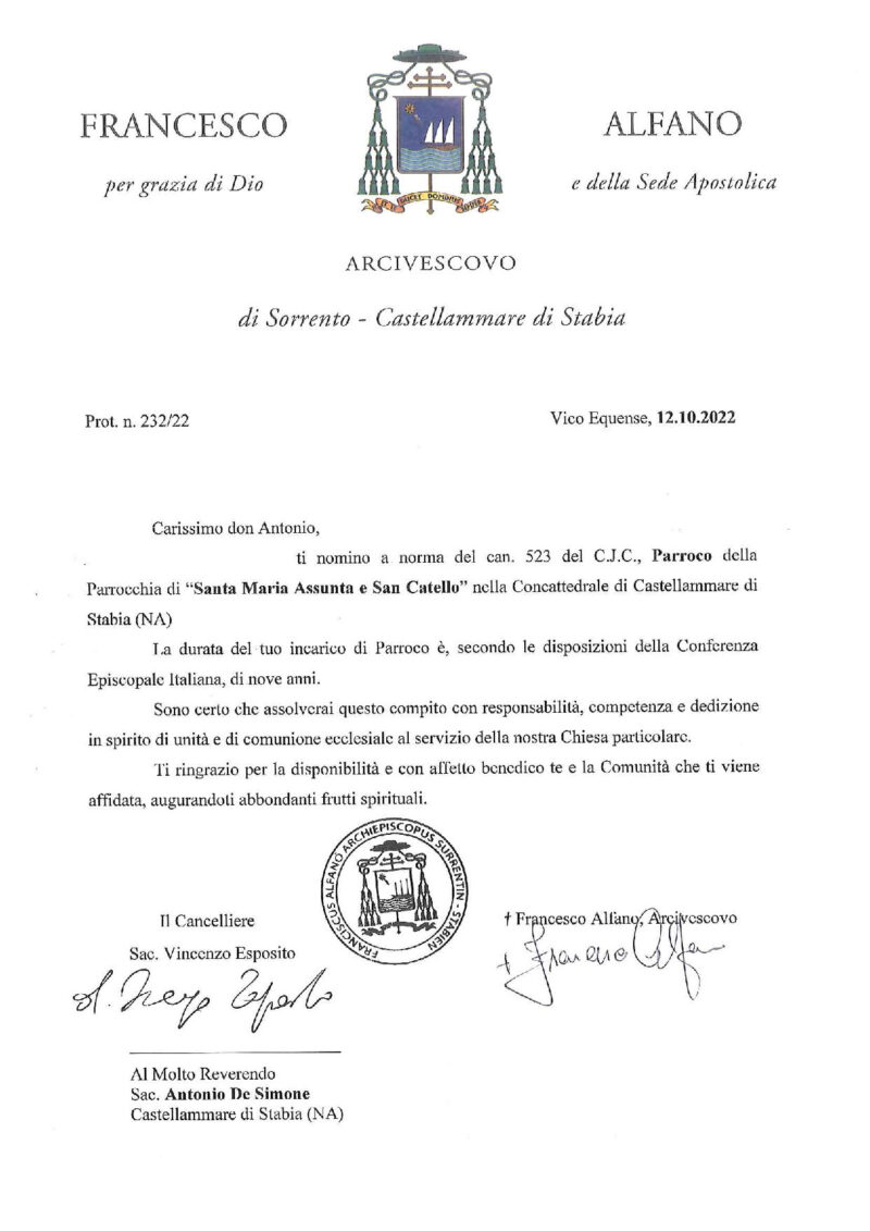 Don Antonio De Simone, in data 12 ottobre 2022, è stato nominato Parroco della parrocchia Santa Maria Assunta e San Catello, nella Concattedrale di Castellammare di Stabia.