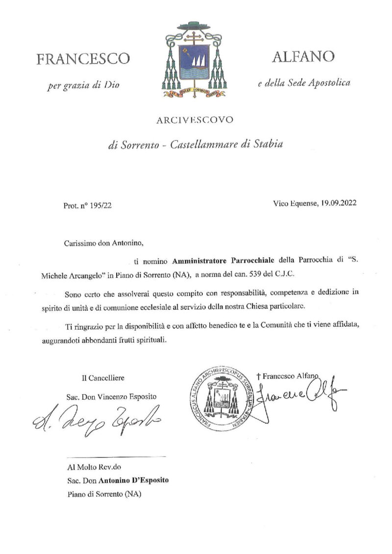 Nomine 19 Settembre 2022 Amministratore Parrocchiale San Michele Arcangelo, Piano di Sorrento Don Antonino D’Esposito, in data 19 settembre 2022, è stato nominato Amministratore Parrocchiale della parrocchia San Michele Arcangelo , Piano di Sorrento.