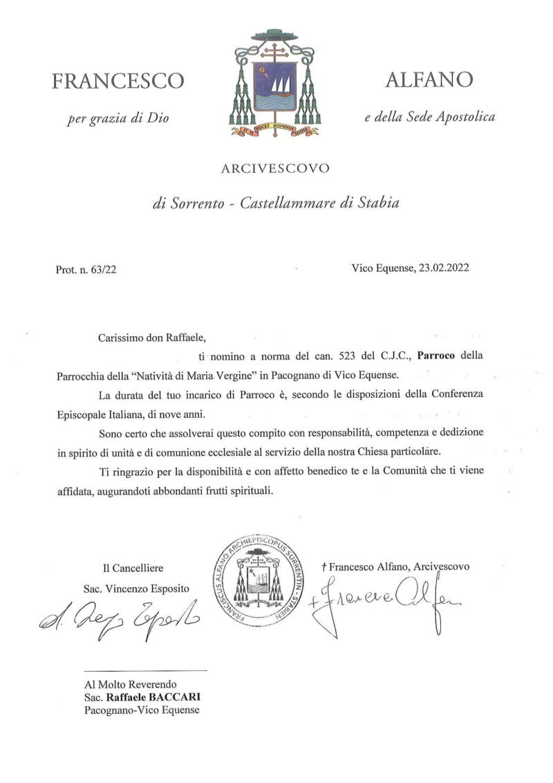 Nomine 23 Febbraio 2022 Parroco per la Parrocchia Natività di Maria Vergine in Pacognano di Vico Equense Don Raffaele Baccari, in data 23 febbraio 2022, è stato nominato Parroco della parrocchia Natività di Maria Vergine in Pacognano Vico Equense.
