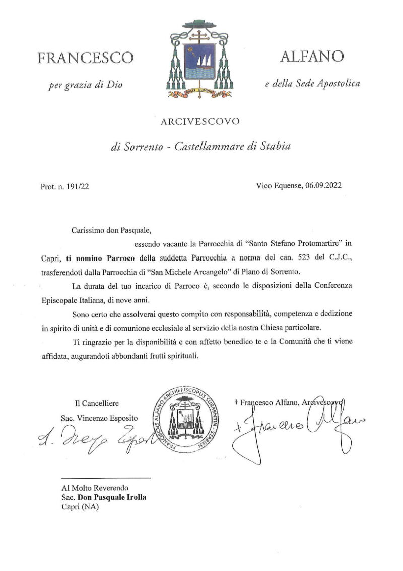 Avvisi per il Clero, Nomine 6 Settembre 2022 Parroco per la Parrocchia Santo Stefano Protomartire in Capri Don Pasquale Irolla, in data 06 settembre 2022, è stato nominato Parroco della parrocchia Santo Stefano Protomartire in Capri.