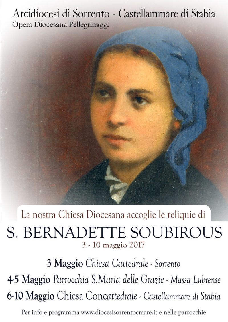 Sono giunti al termine gli otto giorni che hanno visto larcidiocesi di Sorrento Castellammare di Stabia accogliere ed ospitare le reliquie di S. Bernadette Soubirous. La Cattedrale di Sorrento, la Concattedrale di Castellammare di Stabia e la parrocchia S. Maria delle Grazie di Massa Lubrense hanno aperto le porte alla giovane santa amata da tutti per la semplicità e per la grande fede facendola … Continue reading La nostra Chiesa Diocesana accompagna personalmente le reliquie di S. Bernadette a Lourdes