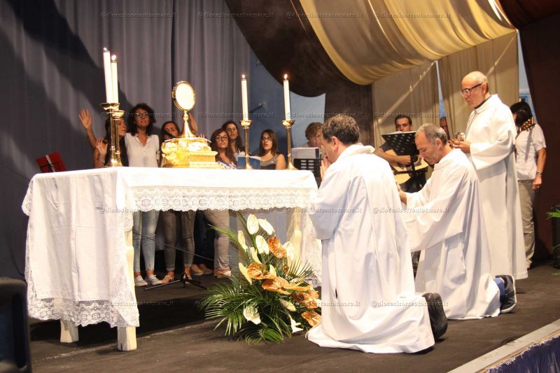 La risposta è giunta in un silenzio che sembrava quasi irreale, quando facendosi largo tra la folla, è arrivata la teca contenente il Pane Eucaristico. Intronizzato il Santissimo Sacramento, è iniziato un dialogo fatto di canti, di Parola, di pause di silenzio, di parole che a nome dell’assemblea, il nostro Arcivescovo ha rivolto in maniera accorata e sincera a Gesù Eucaristico. “….O Dio, tu sei il mio Dio, all’aurora ti cerco, di Te ha sete l’anima mia….” (Sal.63,2). Nessuno è stato redarguito, nessuno è stato aspramente rimproverato, nessuno è stato cacciato via ! Tutti siamo stati invitati “ O voi tutti assetati venite all’acqua, chi non ha denaro venga ugualmente, comprate  e mangiate senza denaro e senza spesa, vino e latte…” (Is. 55,1 ss)