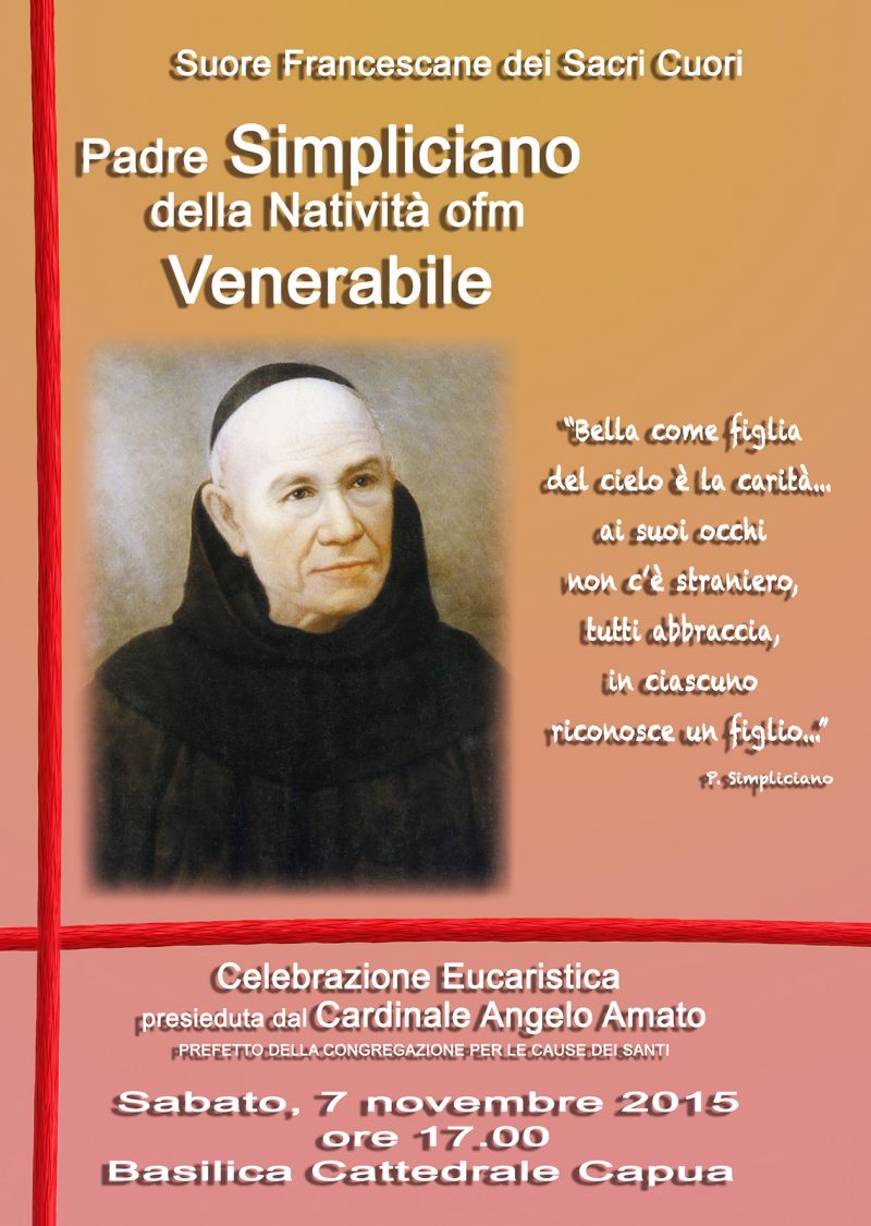 La Comunità delle Suore Francescane dei Sacri Cuori, ci invitano alla preghiera e – per tutti quelli che possono – alla partecipazione alla Solenne Celebrazione del 7 novembre 2015 in occasione della Venerabilità del nostro amato Fondatore, Padre Simpliciano della Natività! E’ un evento che la Famiglia religiosa ha atteso nella preghiera e nella viva speranza di vedere riconosciute le virtù eroiche di questo Servo di Dio, quale fase indispensabile per procedere verso la sua beatificazione!