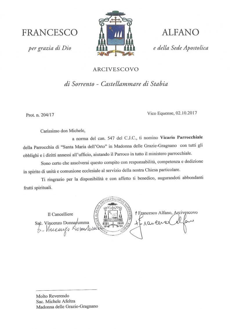 Don Michele Afeltra, in data 2 ottobre 2017, è stato nominato Vicario Parrochiale della parrocchia Santa Maria dell’Orto in Madonna delle Grazie in Gragnano.