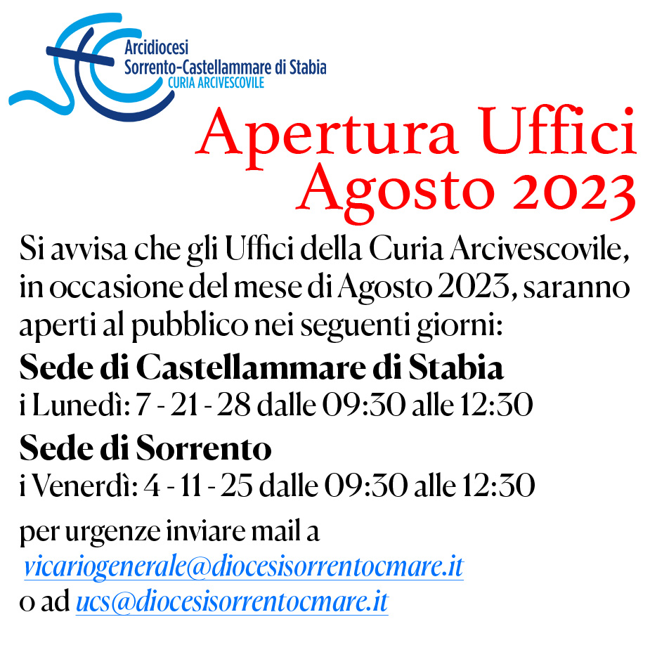 Si avvisa che gli Uffici della Curia Arcivescovile, in occasione del mese di Agosto 2023, saranno aperti al pubblico nei seguenti giorni: