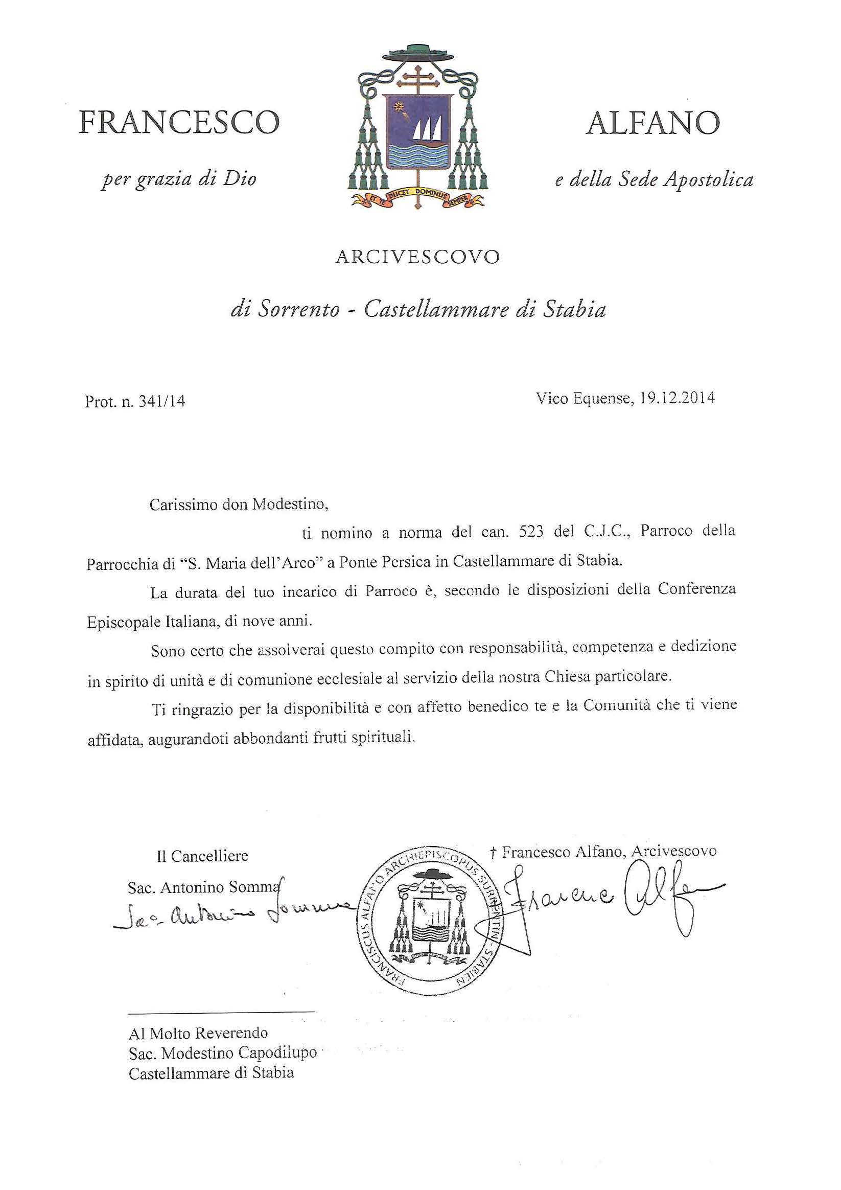 Don Modestino Capodilupo, in data 19 dicembre 2014, stato nominato parroco della parrocchia di Santa Maria dell’Arco a Ponte Persica, a Castellammare di Stabia.