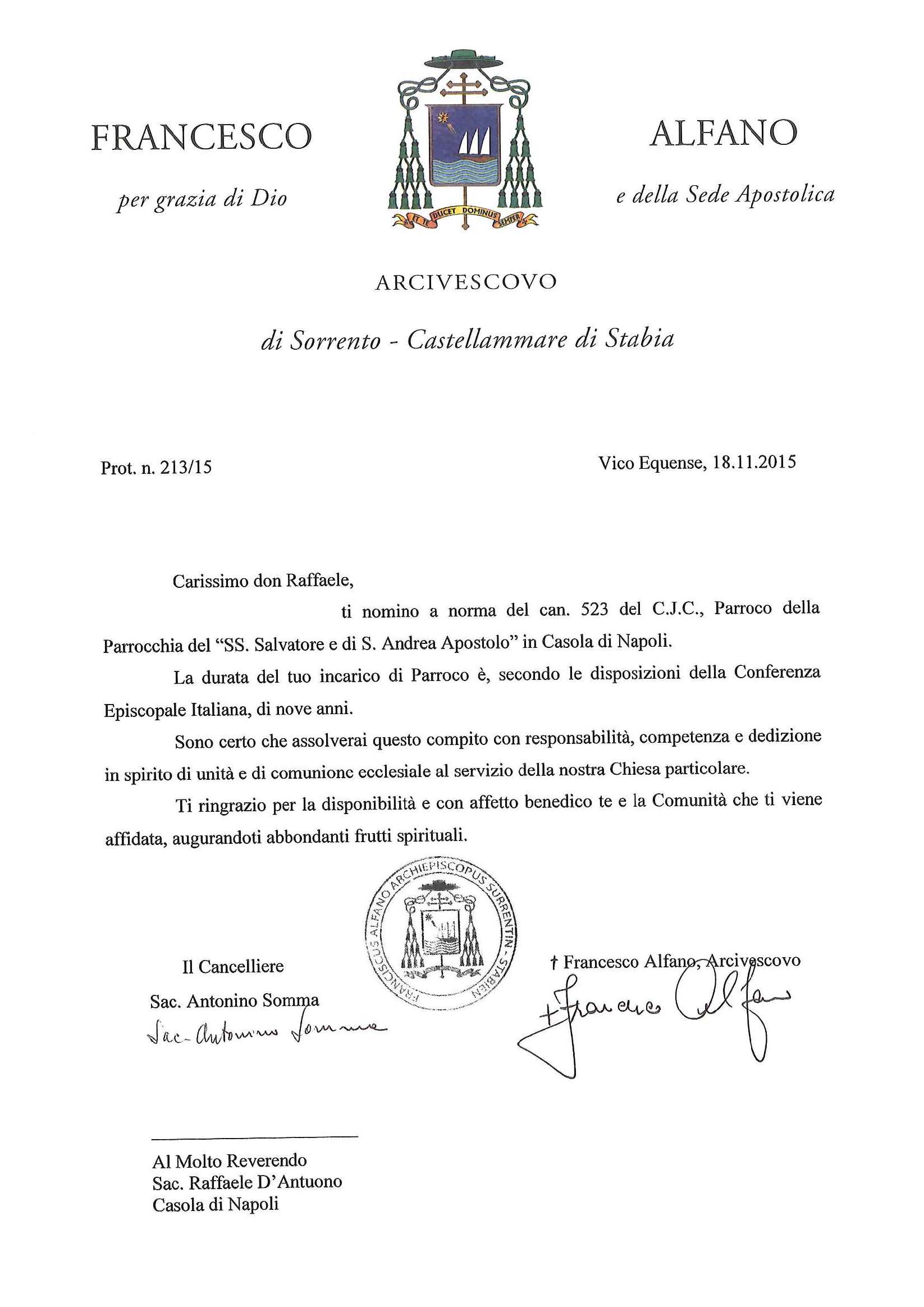 Don Raffaele D’Antuono, in data 18 novembre 2015, è stato nominato parroco della parrocchia del Santissimo Salvatore e Sant’Andrea Apostolo, in Casola di Napoli.