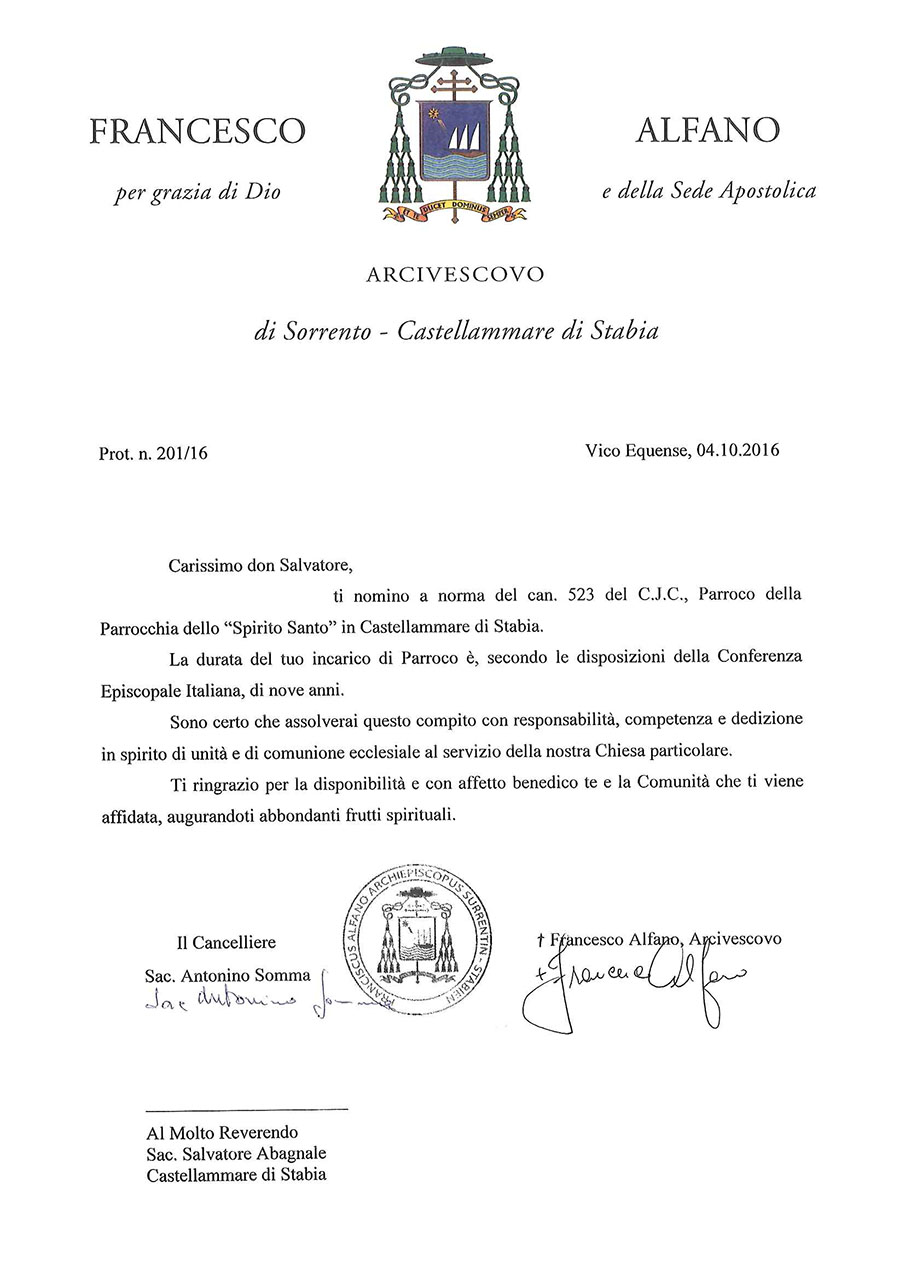 Don Salvatore Abagnale, in data 04 ottobre 2016, è stato nominato parroco della parrocchia dello “Spirito Santo” in Castellammare di Stabia.