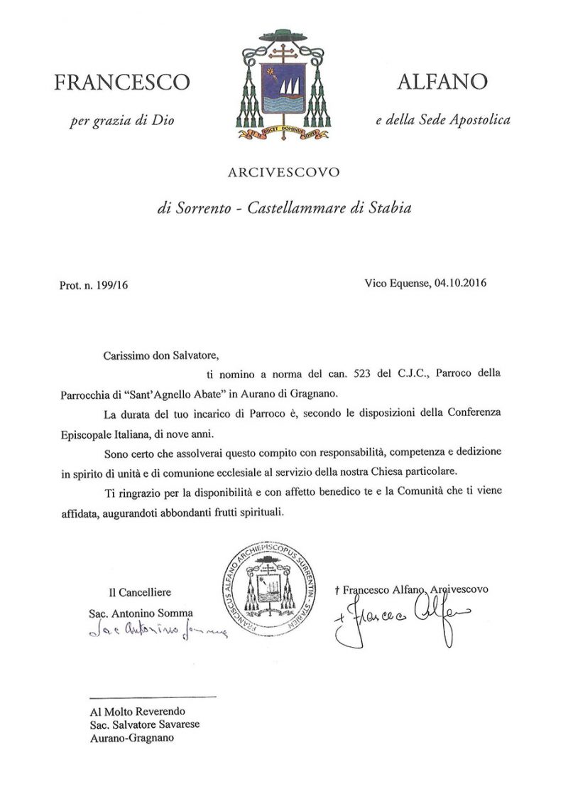 Don Salvatore Savarese, in data 04 ottobre 2016, è stato nominato parroco della parrocchia di “Sant’Agnello Abate” in Aurano di Gragnano.