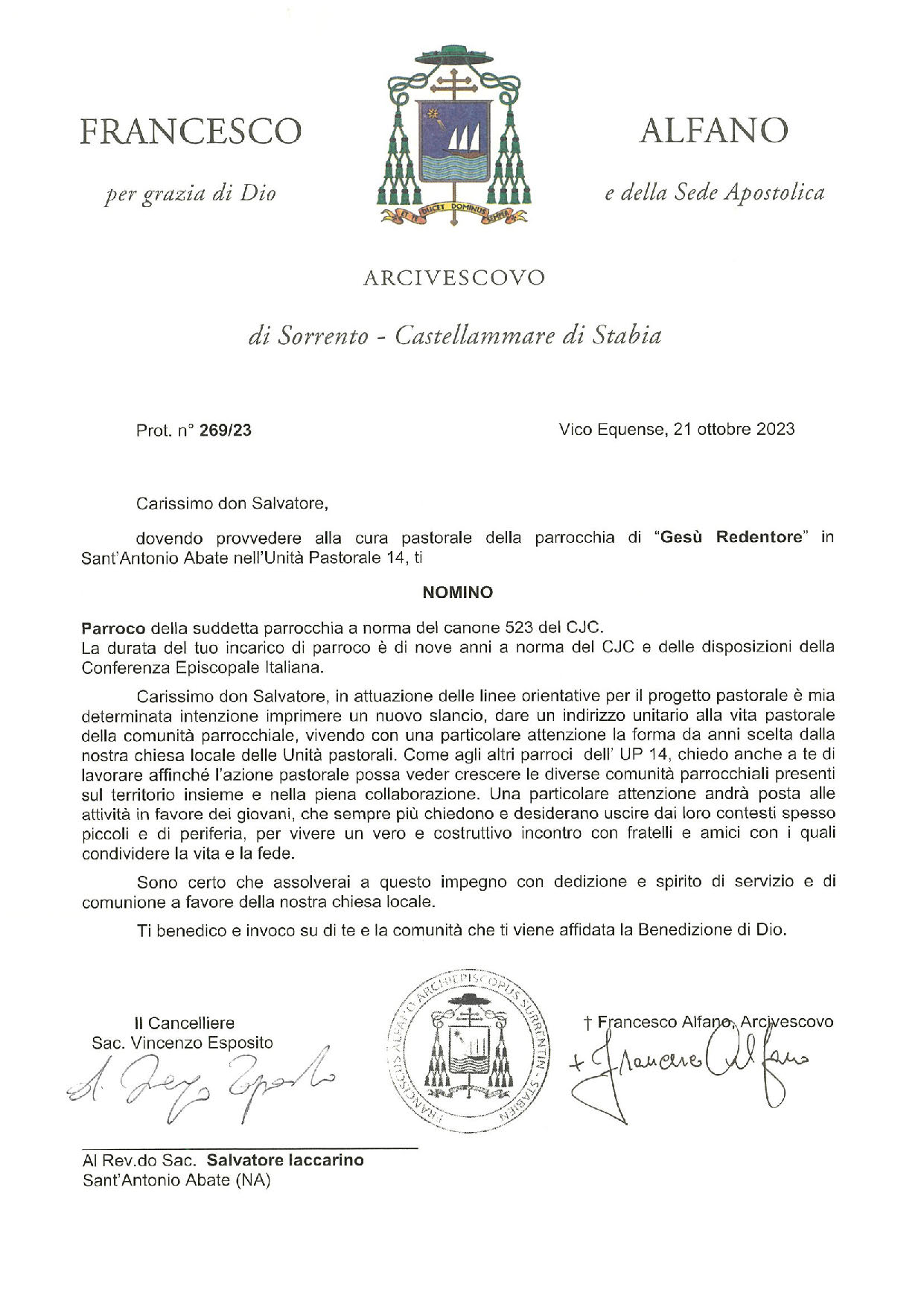 Don Salvatore Iaccarino, in data 21 ottobre 2023, è stato nominato Parroco della parrocchia Gesù Redentore, Sant’Antonio Abate