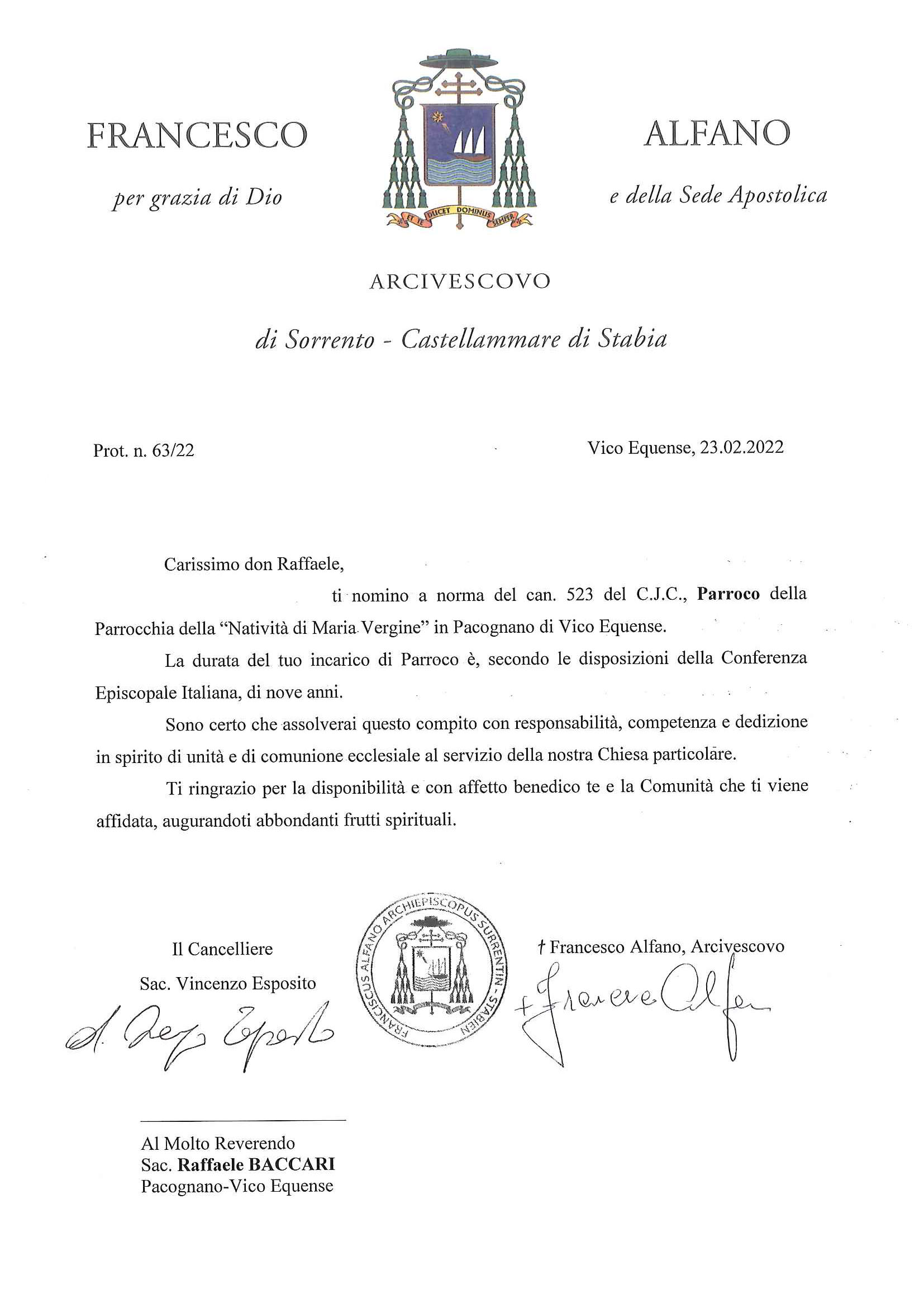 Don Raffaele Baccari, in data 23 febbraio 2022, è stato nominato Parroco della parrocchia Natività di Maria Vergine in Pacognano Vico Equense.
