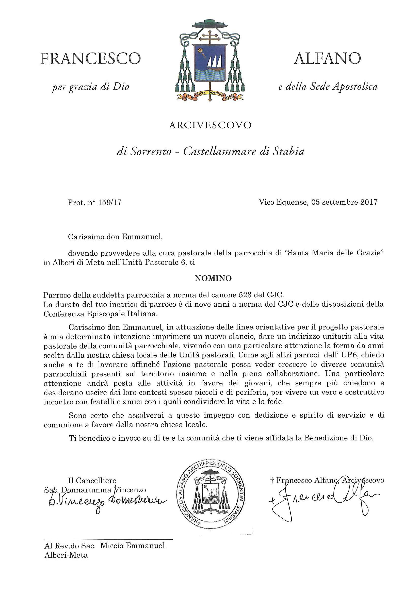 Don Emmanuel Miccio, in data 5 settembre 2017, è stato nominato Parroco della parrocchia Santa Maria delle Grazie in Alberi Meta.