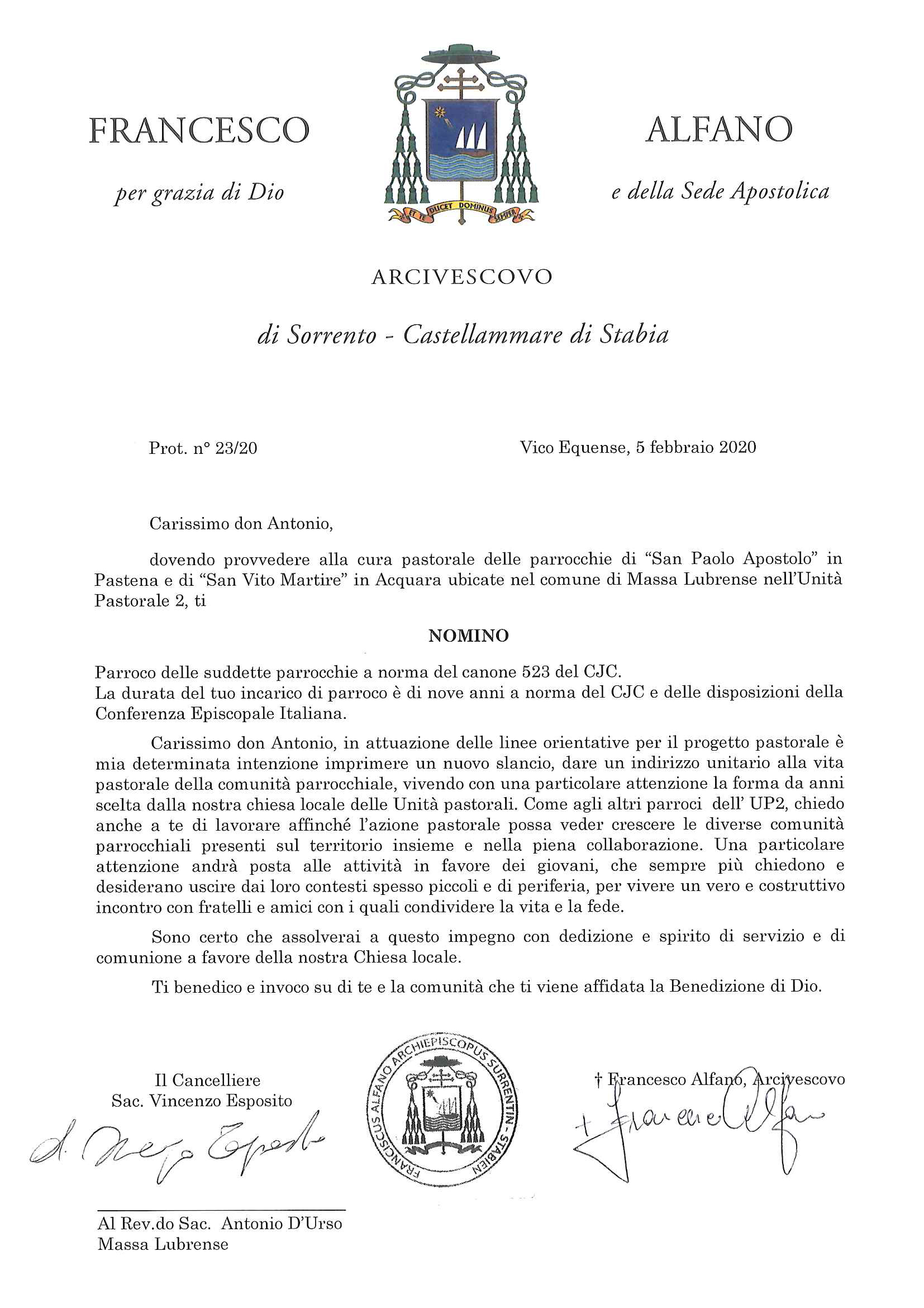 Don Antonio D’Urso, in data 05 febbraio 2020, è stato nominato Parroco delle parrocchie San Paolo Apostolo in Pastena e San Vito Martire in Acquara, ubicate nel comune di Massa Lubrense