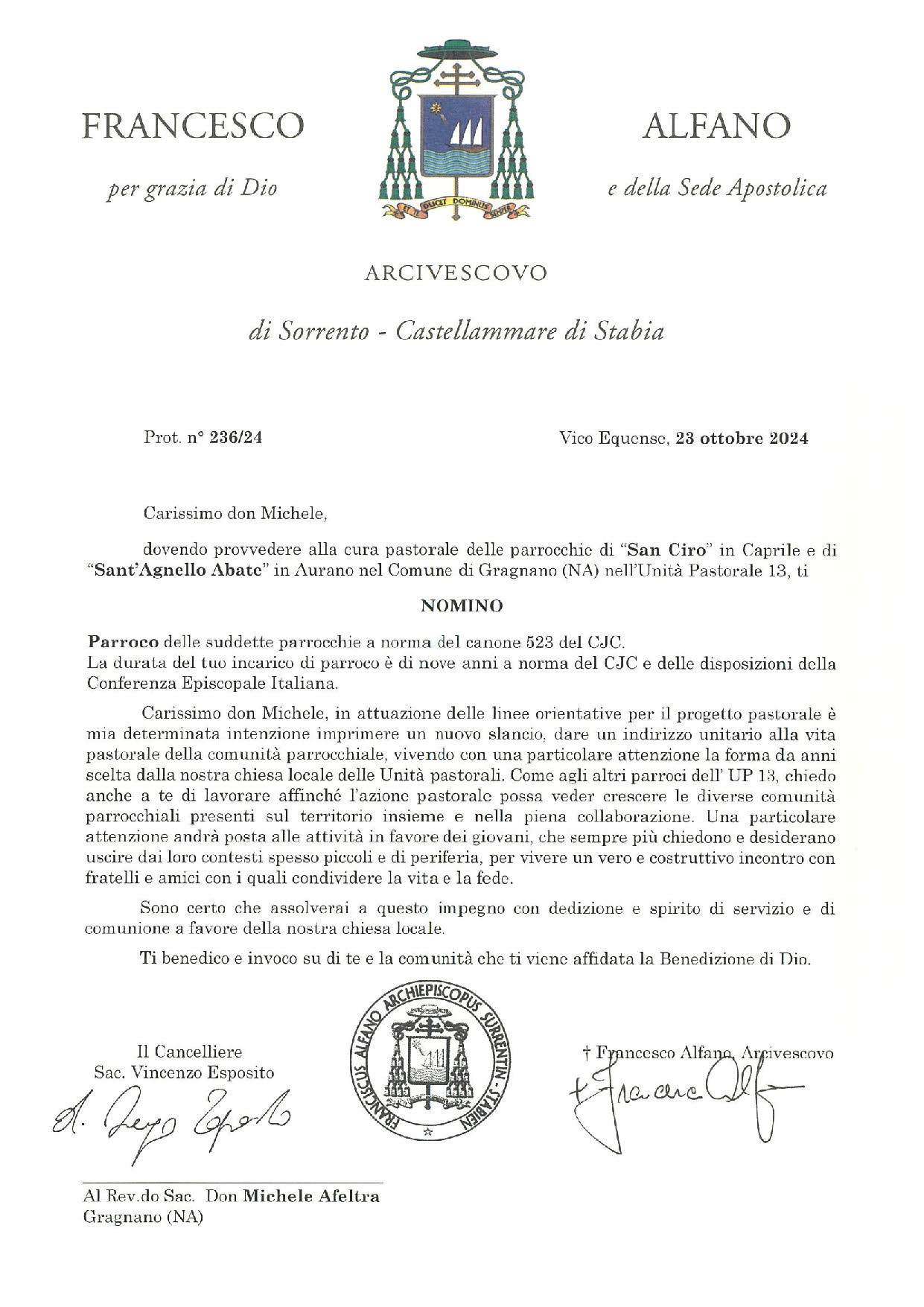 Don Michele Afeltra, in data 23 ottobre 2024, è stato nominato Parroco delle parrocchie “San Ciro” in Caprile e “Sant’Agnello Abate” in Aurano, Gragnano.