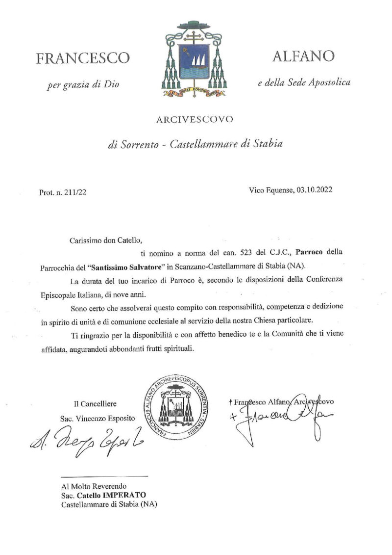 Don Catello Imperato, in data 03 ottobre 2022, è stato nominato parrocco della parrocchia Santissimo Salvatore, Castellammare di Stabia.