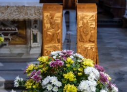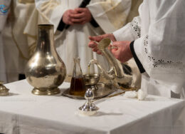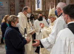 Emozionante il momento della benedizione degli oli, che si useranno durante tutto l’anno liturgico per la celebrazione dei sacramenti. Il crisma, usato nel battesimo, nella cresima e nell’ordinazione dei presbiteri e dei vescovi è stato consegnato da cresimandi della parrocchia di Sant’Agostino e Madonna di Lourdes di Castellammare di Stabia; l’olio dei catecumeni, usato nel battesimo è stato invece portare dinanzi al Vescovo da una famiglia il cui bambino riceverà il battesimo a Sant’Agnello nella veglia pasquale e da catecumeni che riceveranno l’iniziazione cristiana durante il periodo pasquale; ed infine la consegna dell’olio degli infermi è avvenuta da parte di operatori dell’ospedale di Sorrento e Don Salvatore Rossi cappellano dell’ospedale di Vico Equense.