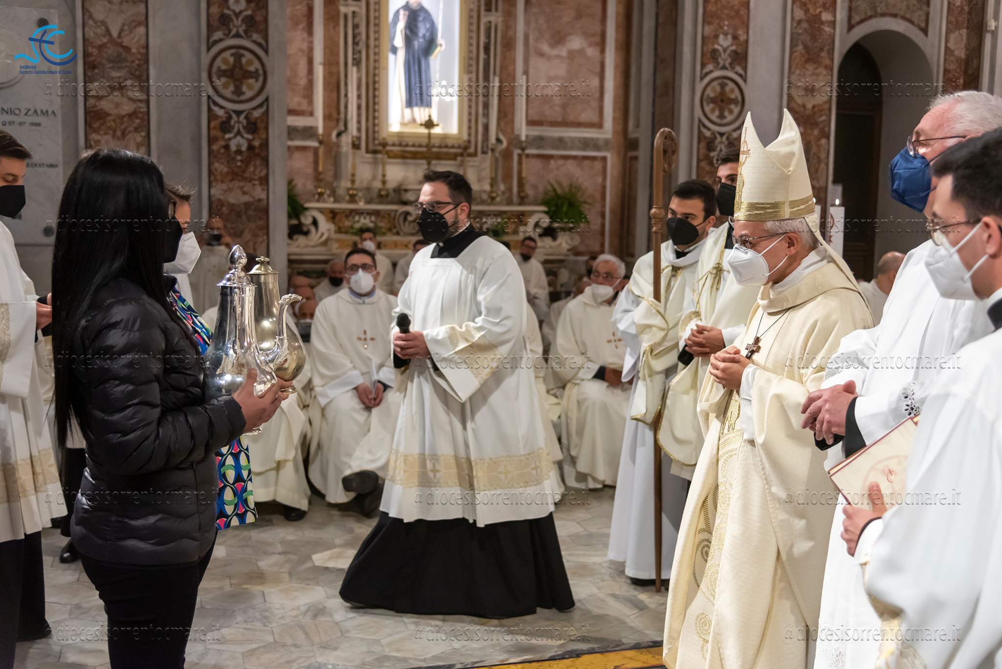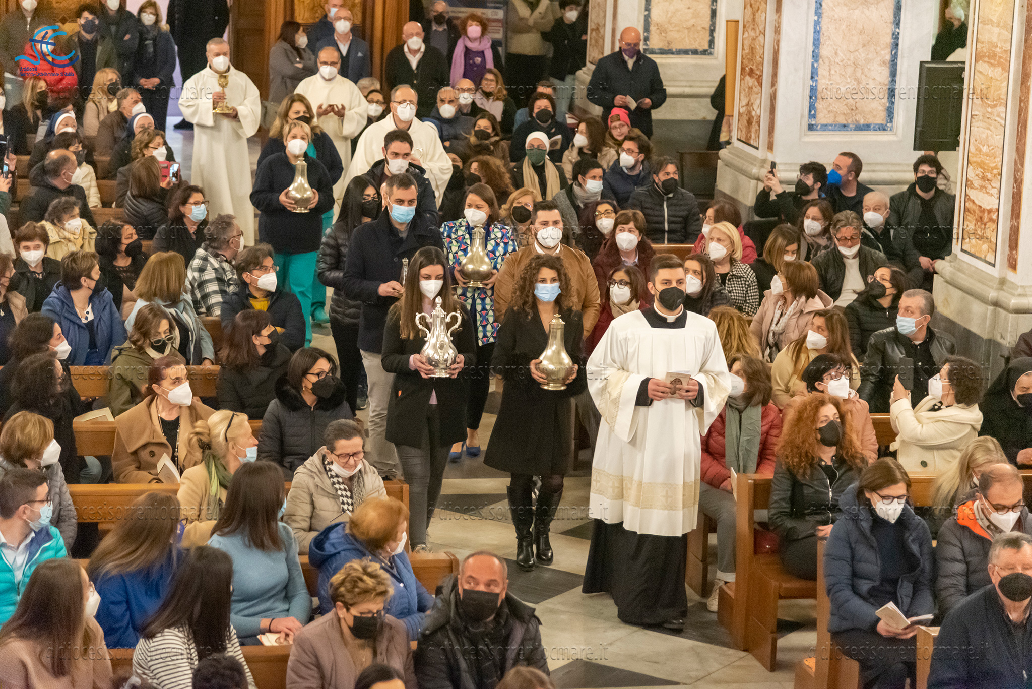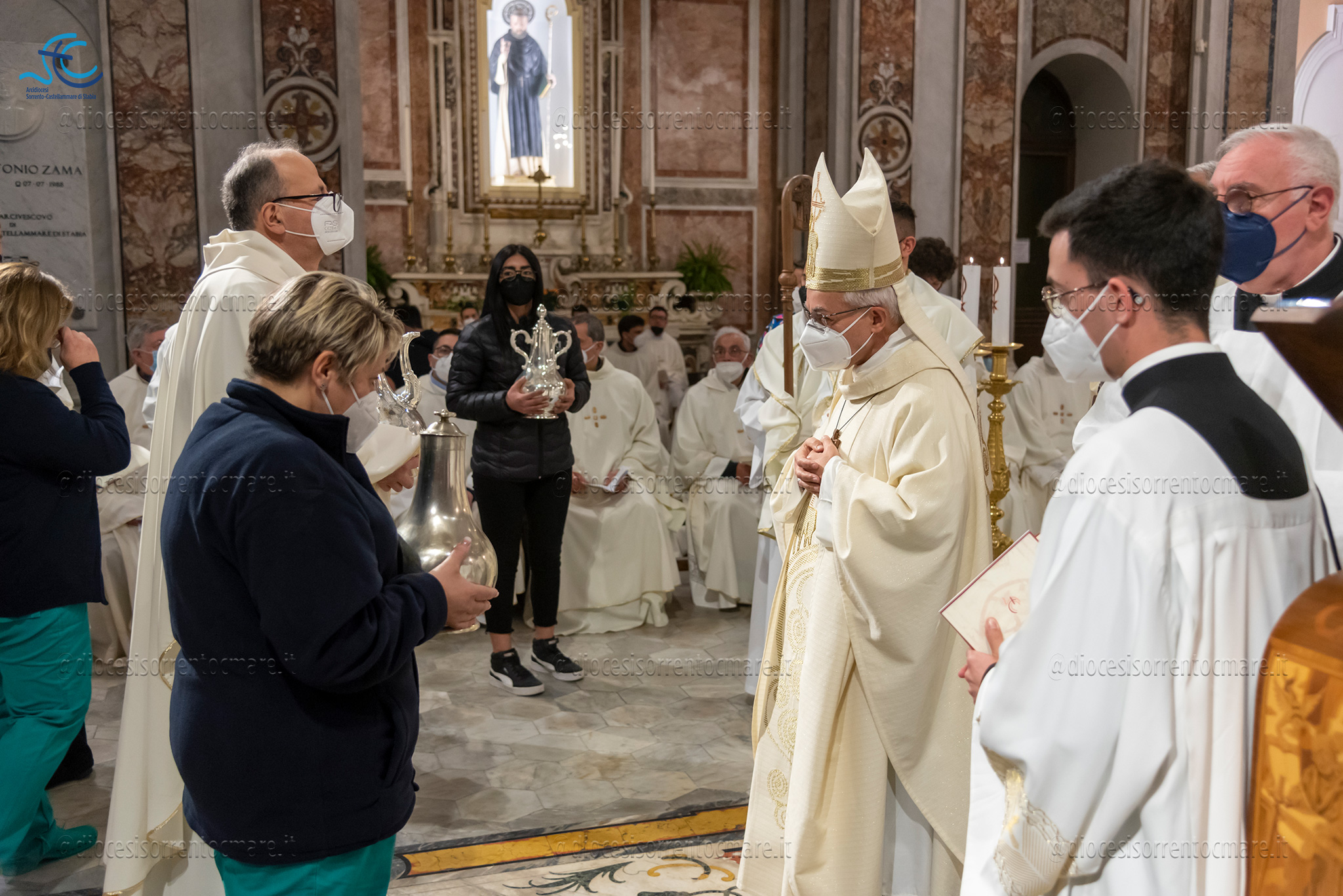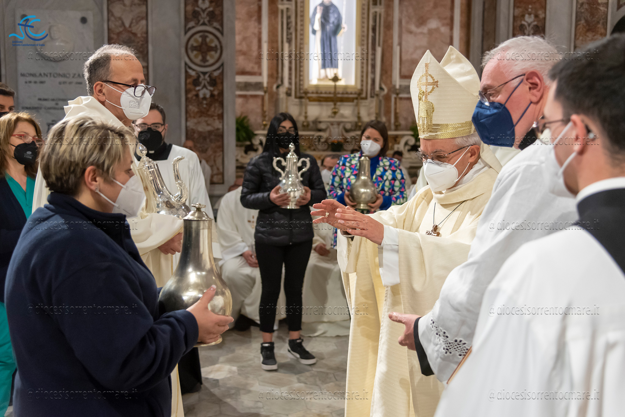 Emozionante il momento della benedizione degli oli, che si useranno durante tutto l’anno liturgico per la celebrazione dei sacramenti. Il crisma, usato nel battesimo, nella cresima e nell’ordinazione dei presbiteri e dei vescovi è stato consegnato da cresimandi della parrocchia di Sant’Agostino e Madonna di Lourdes di Castellammare di Stabia; l’olio dei catecumeni, usato nel battesimo è stato invece portare dinanzi al Vescovo da una famiglia il cui bambino riceverà il battesimo a Sant’Agnello nella veglia pasquale e da catecumeni che riceveranno l’iniziazione cristiana durante il periodo pasquale; ed infine la consegna dell’olio degli infermi è avvenuta da parte di operatori dell’ospedale di Sorrento e Don Salvatore Rossi cappellano dell’ospedale di Vico Equense.