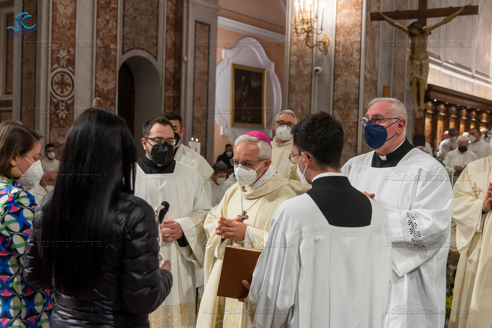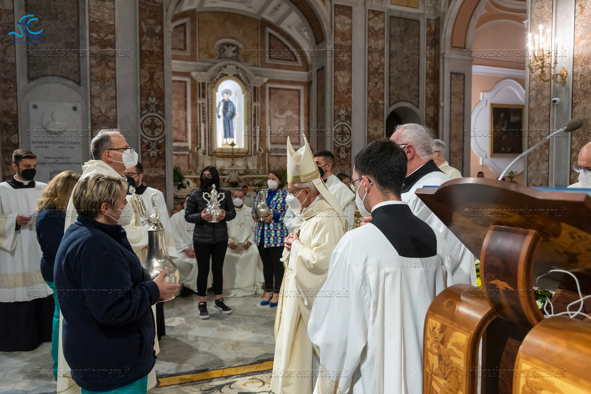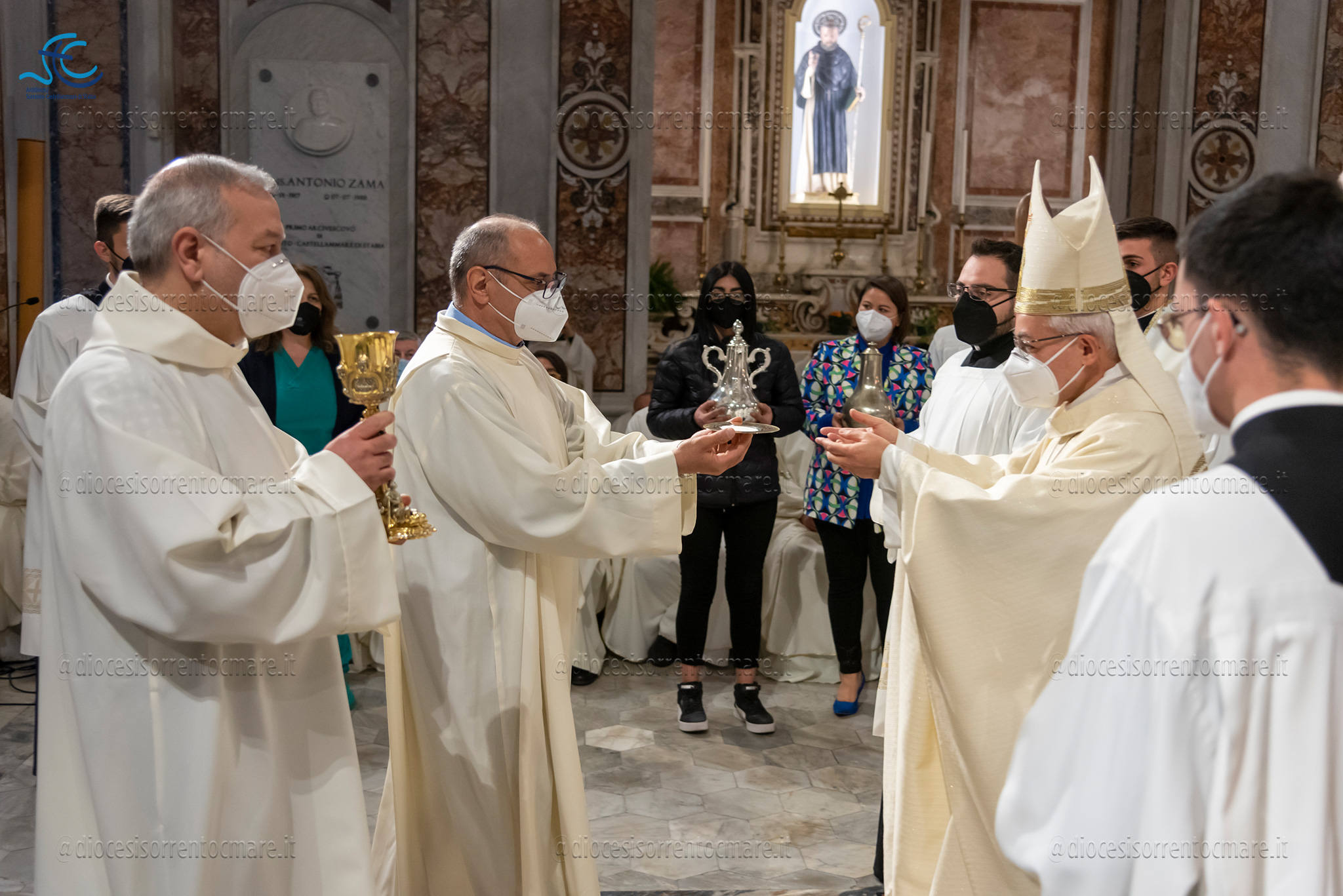 Emozionante il momento della benedizione degli oli, che si useranno durante tutto l’anno liturgico per la celebrazione dei sacramenti. Il crisma, usato nel battesimo, nella cresima e nell’ordinazione dei presbiteri e dei vescovi è stato consegnato da cresimandi della parrocchia di Sant’Agostino e Madonna di Lourdes di Castellammare di Stabia; l’olio dei catecumeni, usato nel battesimo è stato invece portare dinanzi al Vescovo da una famiglia il cui bambino riceverà il battesimo a Sant’Agnello nella veglia pasquale e da catecumeni che riceveranno l’iniziazione cristiana durante il periodo pasquale; ed infine la consegna dell’olio degli infermi è avvenuta da parte di operatori dell’ospedale di Sorrento e Don Salvatore Rossi cappellano dell’ospedale di Vico Equense.