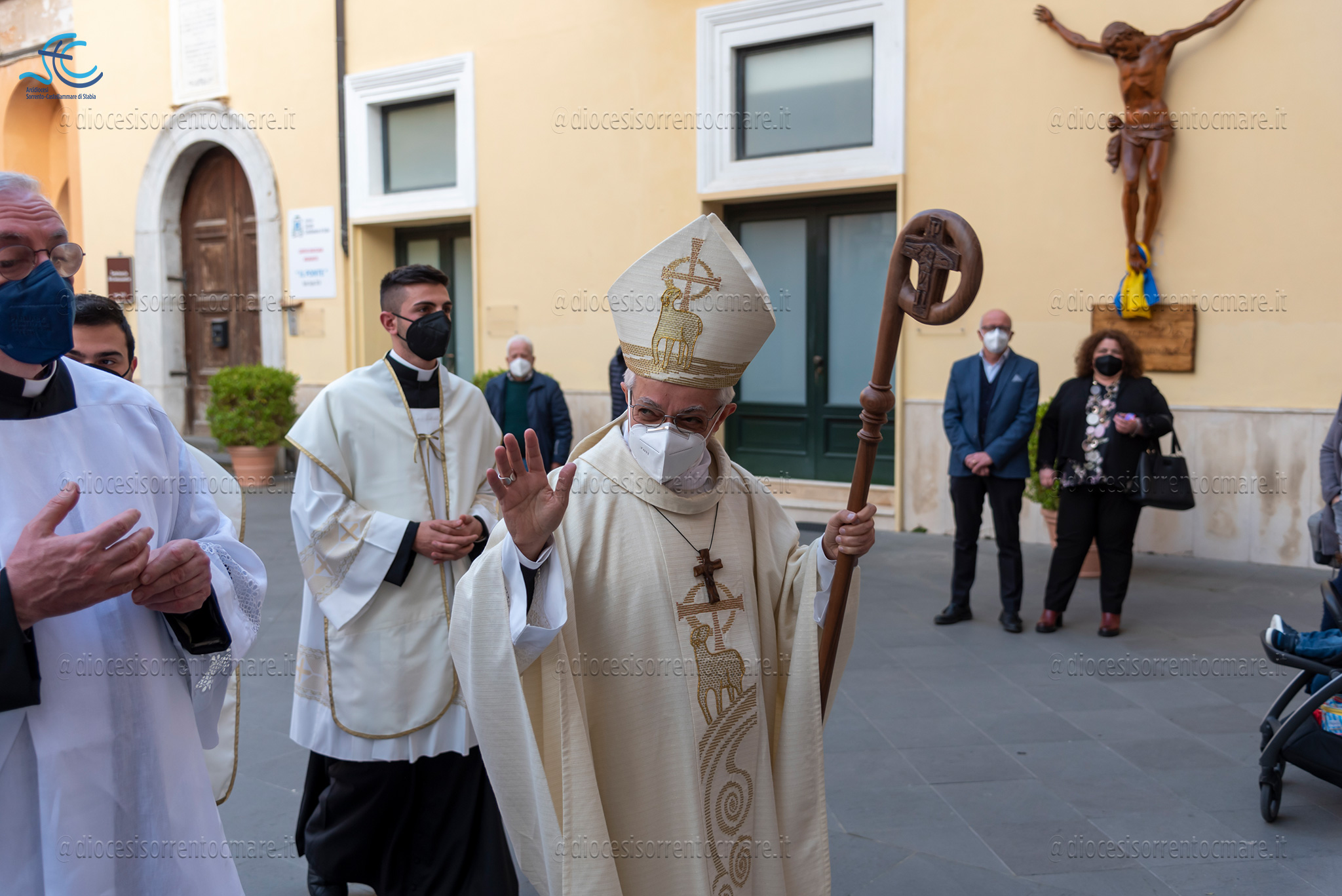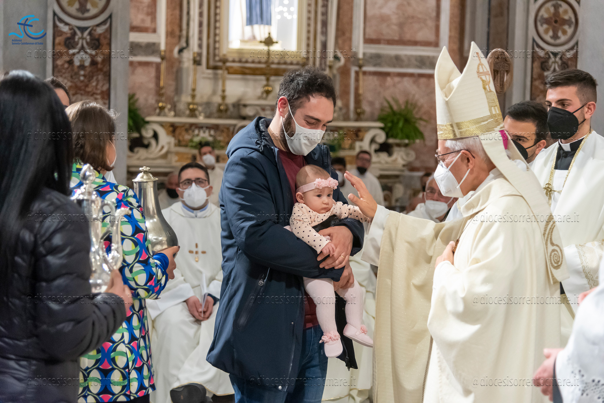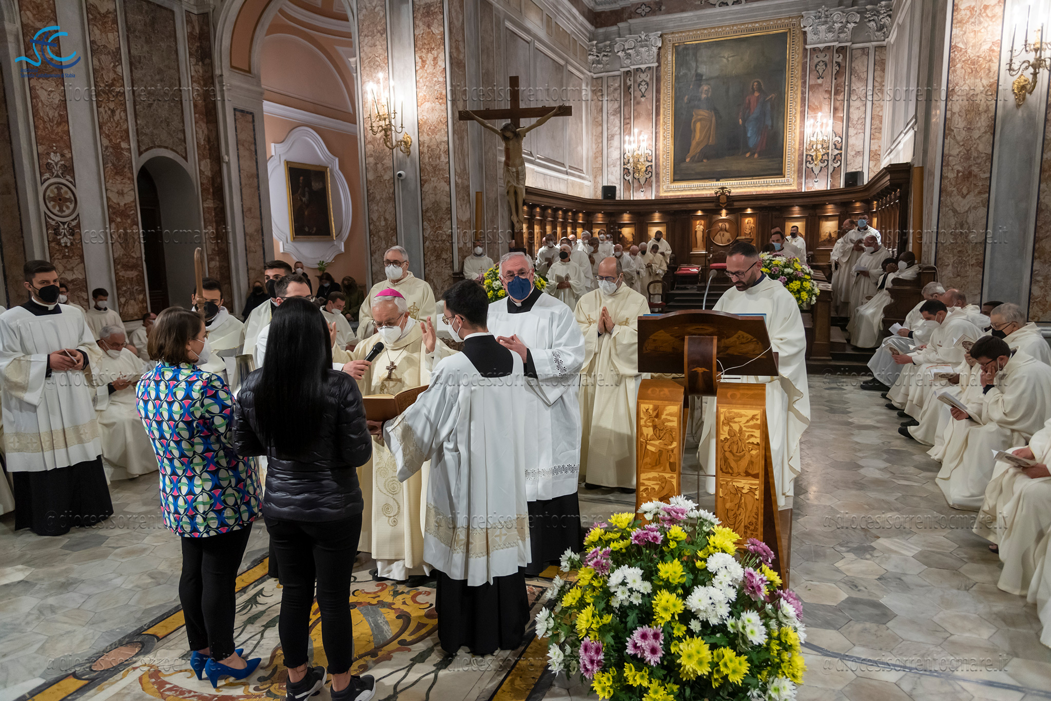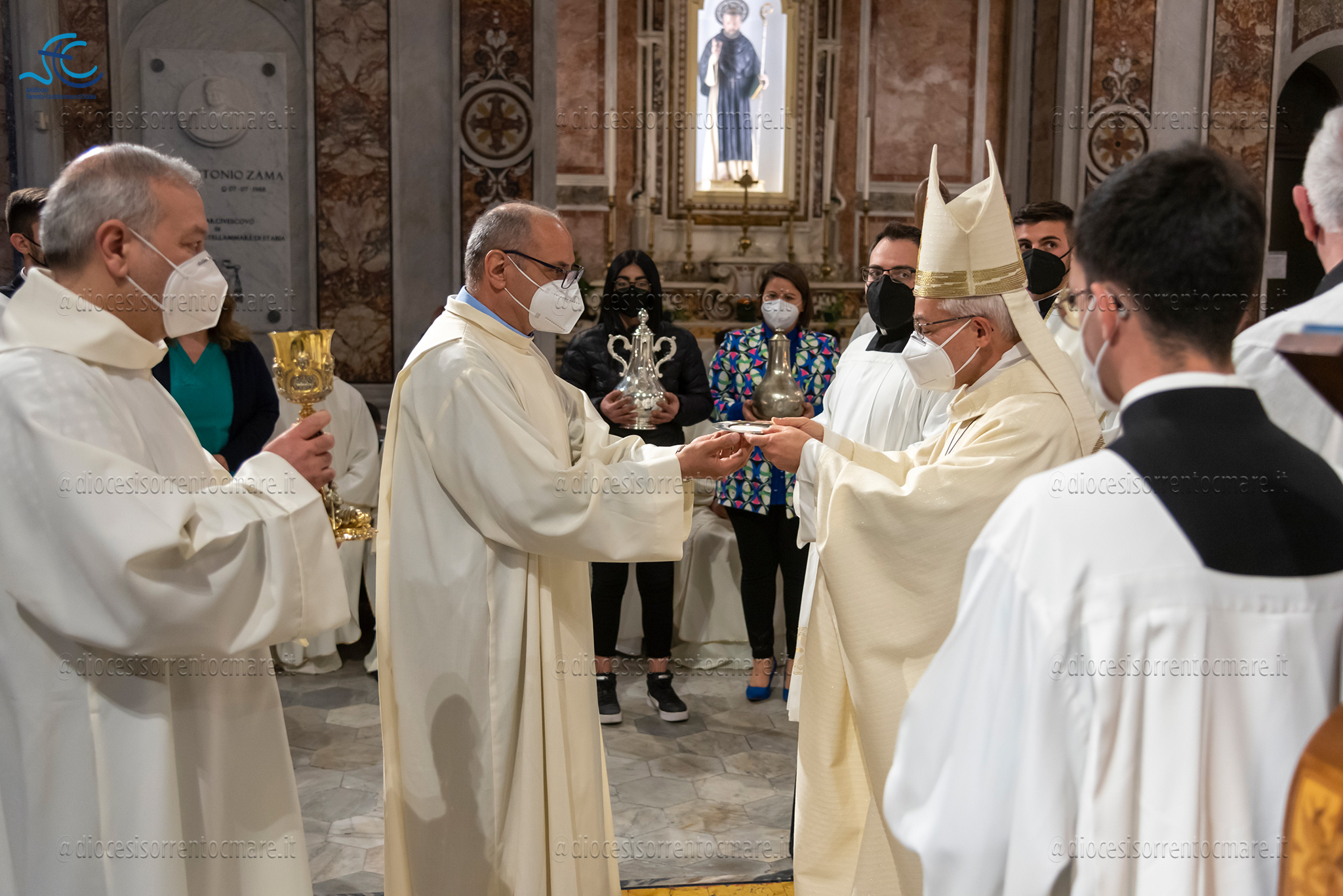 Emozionante il momento della benedizione degli oli, che si useranno durante tutto l’anno liturgico per la celebrazione dei sacramenti. Il crisma, usato nel battesimo, nella cresima e nell’ordinazione dei presbiteri e dei vescovi è stato consegnato da cresimandi della parrocchia di Sant’Agostino e Madonna di Lourdes di Castellammare di Stabia; l’olio dei catecumeni, usato nel battesimo è stato invece portare dinanzi al Vescovo da una famiglia il cui bambino riceverà il battesimo a Sant’Agnello nella veglia pasquale e da catecumeni che riceveranno l’iniziazione cristiana durante il periodo pasquale; ed infine la consegna dell’olio degli infermi è avvenuta da parte di operatori dell’ospedale di Sorrento e Don Salvatore Rossi cappellano dell’ospedale di Vico Equense.