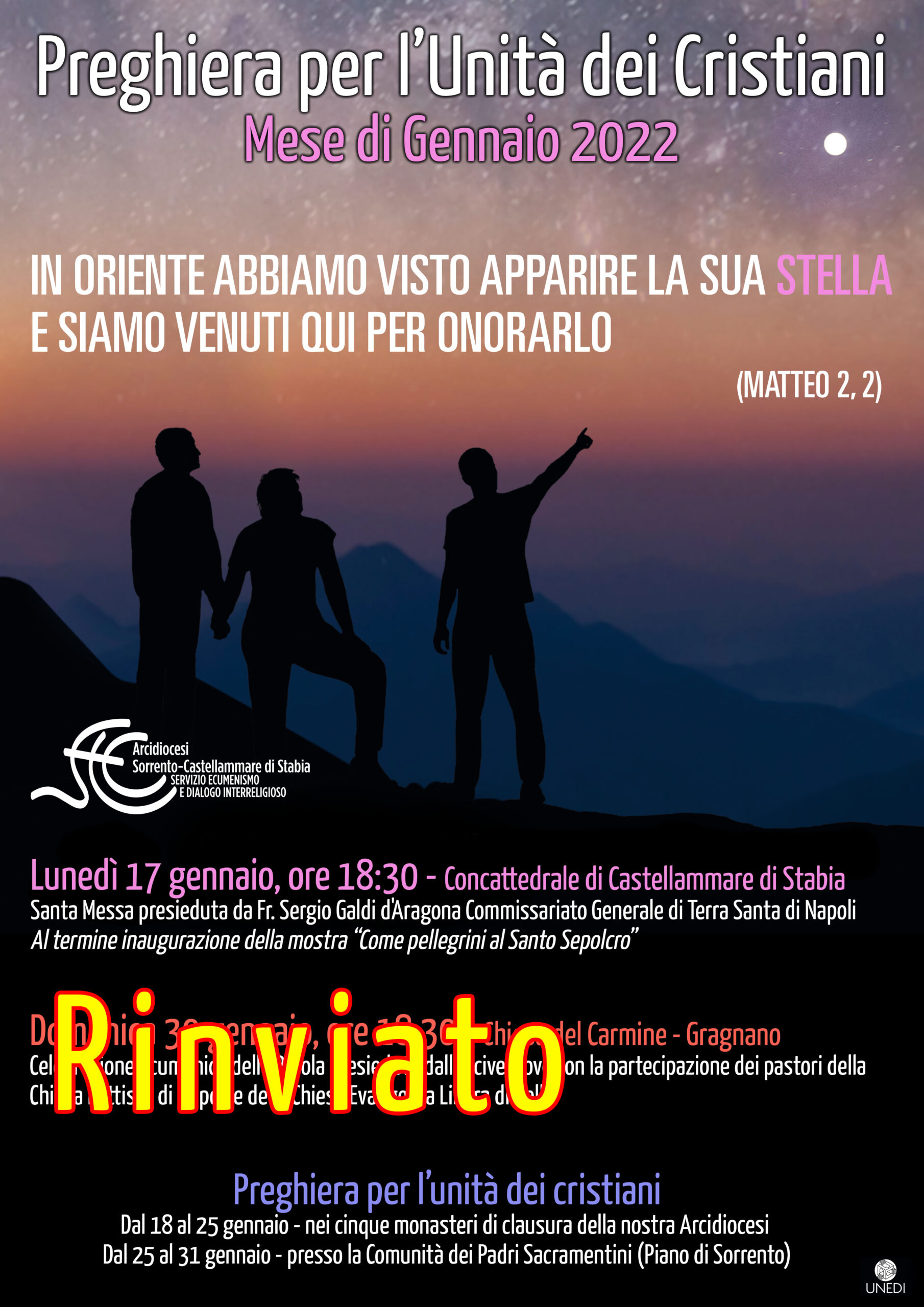 Anche quest’anno nei cinque monasteri contemplativi della nostra Diocesi si pregherà con gli schemi di preghiera proposti per l’ottavario; nell’ultima settimana di gennaio, invece, la preghiera quotidiana sarà presso la comunità dei Padri Sacramentini in Piano di Sorrento: la prima forma di ecumenismo nasce proprio nell’intimità della preghiera.