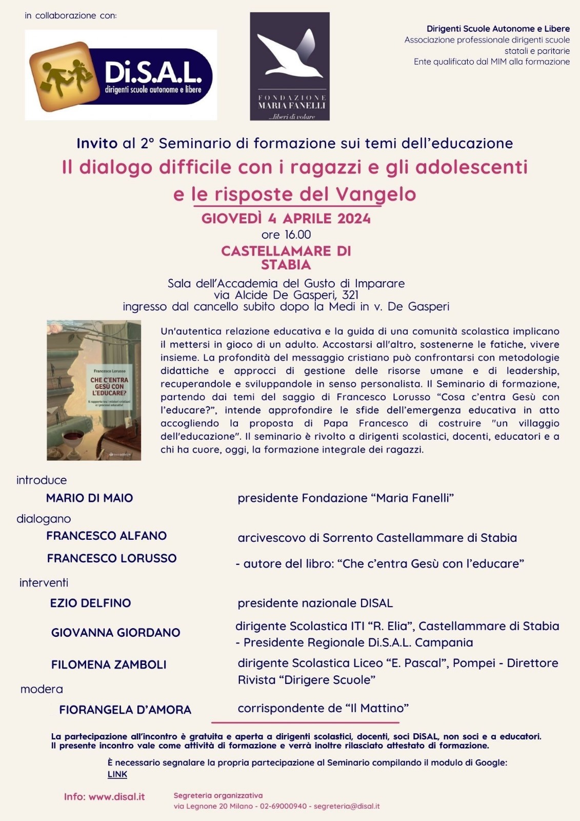 Secondo seminario di formazione sui temi dell’educazione: Il dialogo difficile con i ragazzi e gli adolescenti e le risposte del Vangelo. Presentazione del libro di Francesco Lorusso “Che c’entra Gesù con l’educare“.