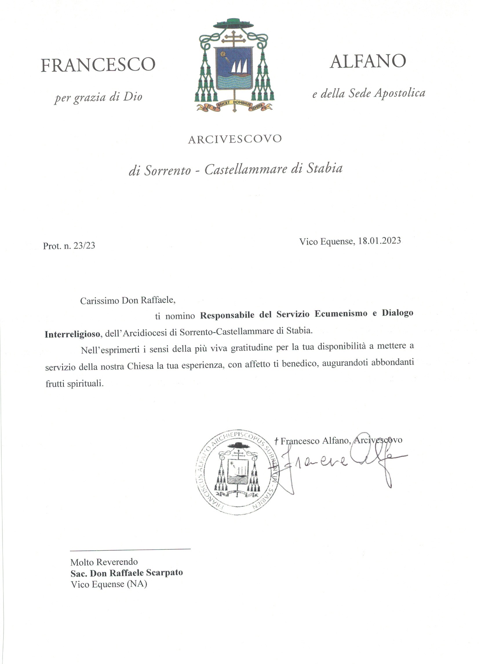 Don Raffaele Scarpato, in data 18 gennaio 2023, è stato nominato Responsabile del Servizio Ecumenismo e Dialogo Interreligioso.