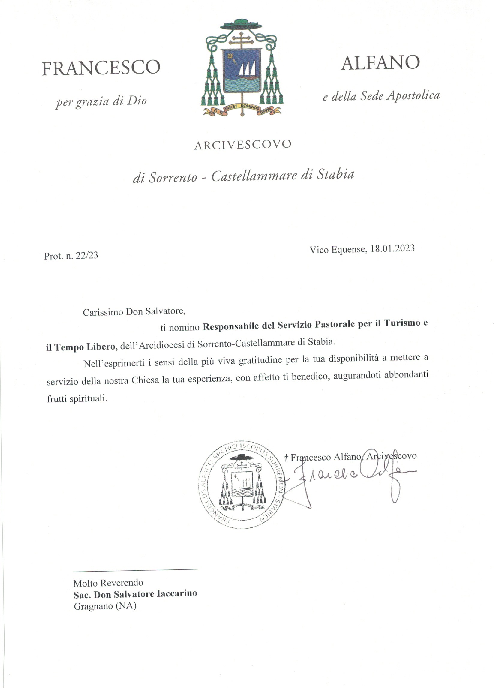 Don Salvatore Iaccarino, in data 18 gennaio 2023, è stato nominato Responsabile del Servizio Pastorale per il Turismo e i Tempo Libero.