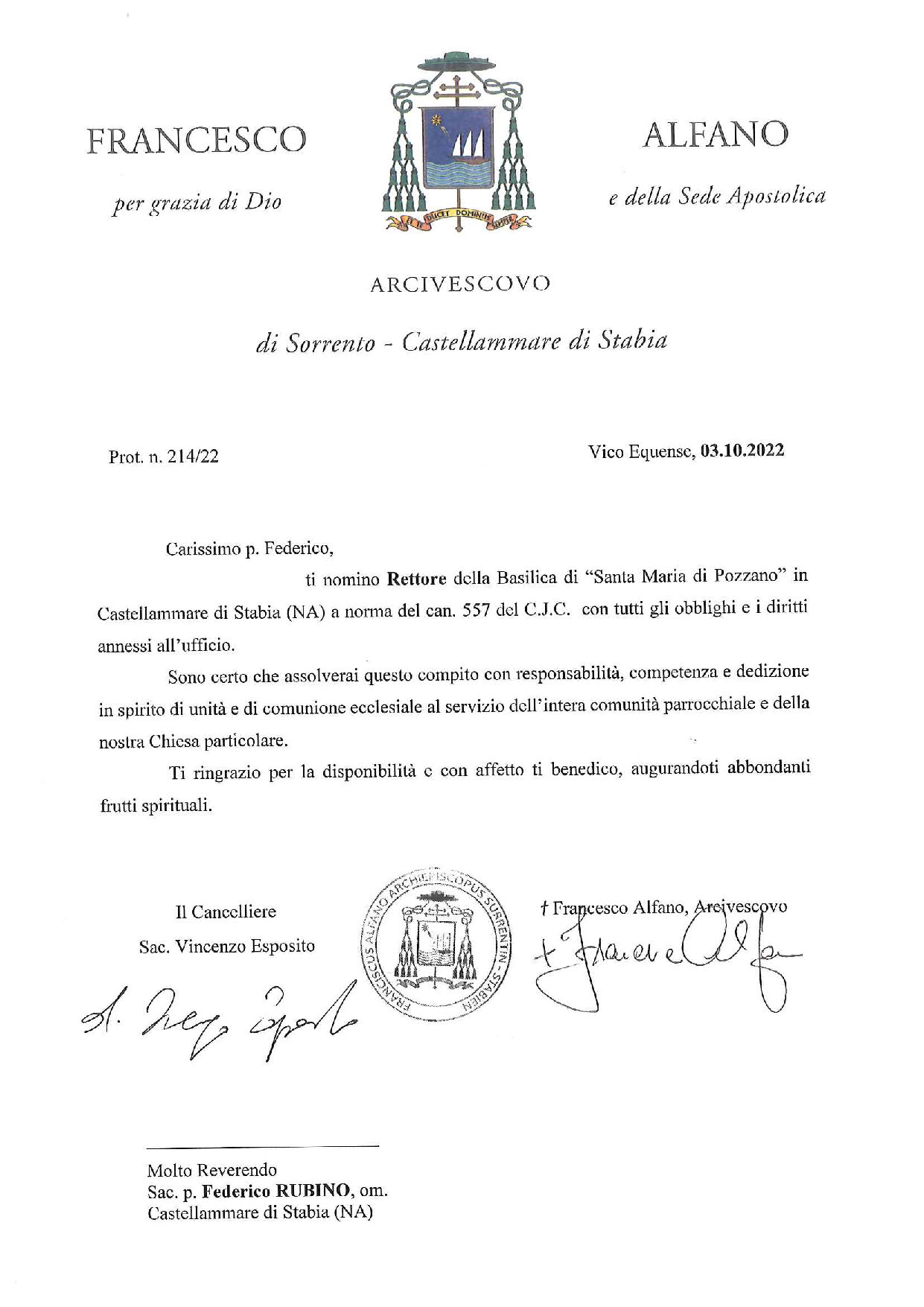 Padre Federico Rubino, om, in data 03 ottobre 2022, è stato nominato rettore della basilica Santa Maria di Pozzano in Castellammare di Stabia.