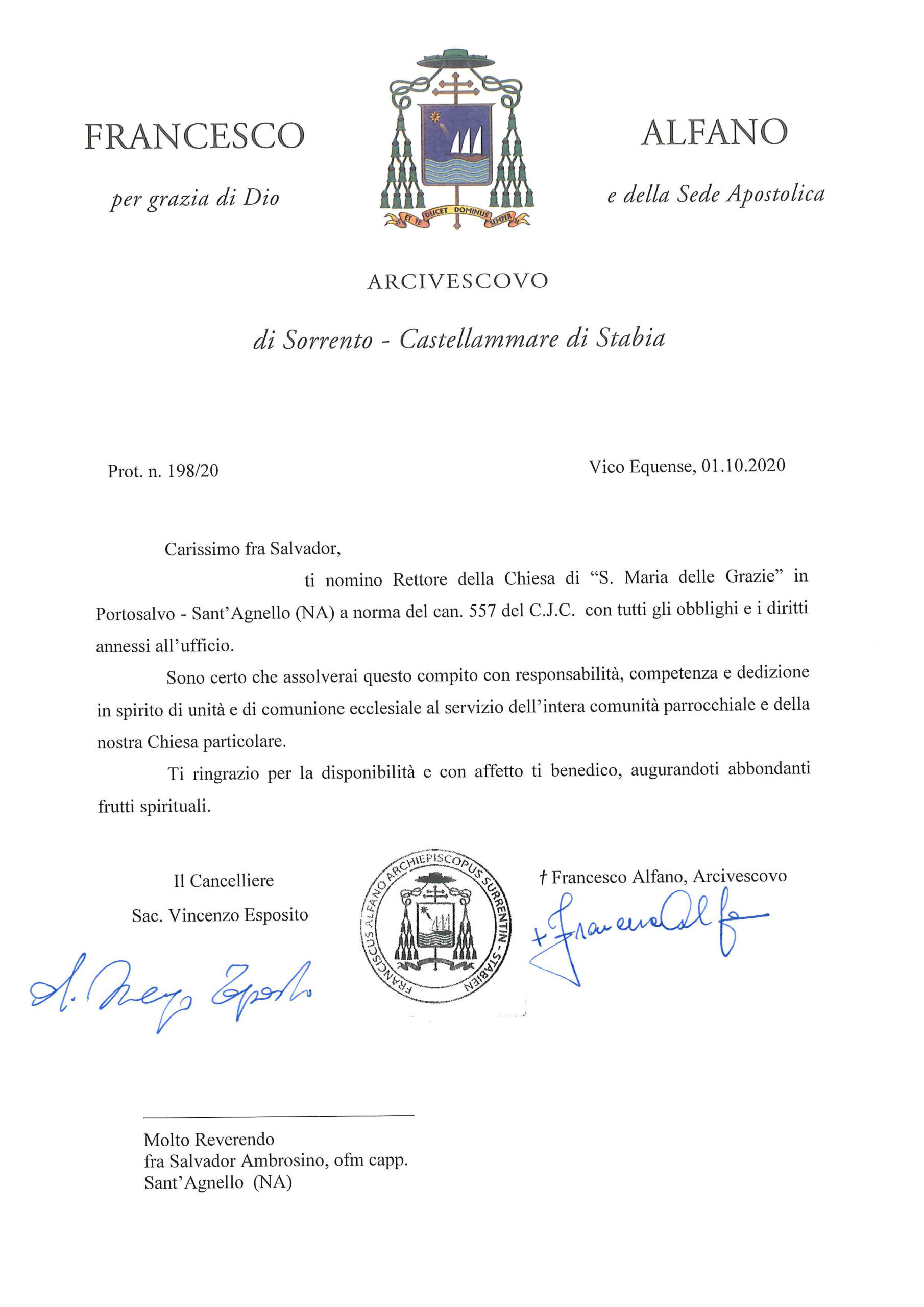 Fra Salvador Ambrosino, ofm capp. in data 01 ottobre 2020, è stato nominato rettore della Chiesa Santa Maria delle Grazie in Portosalvo, Sant’Agnello