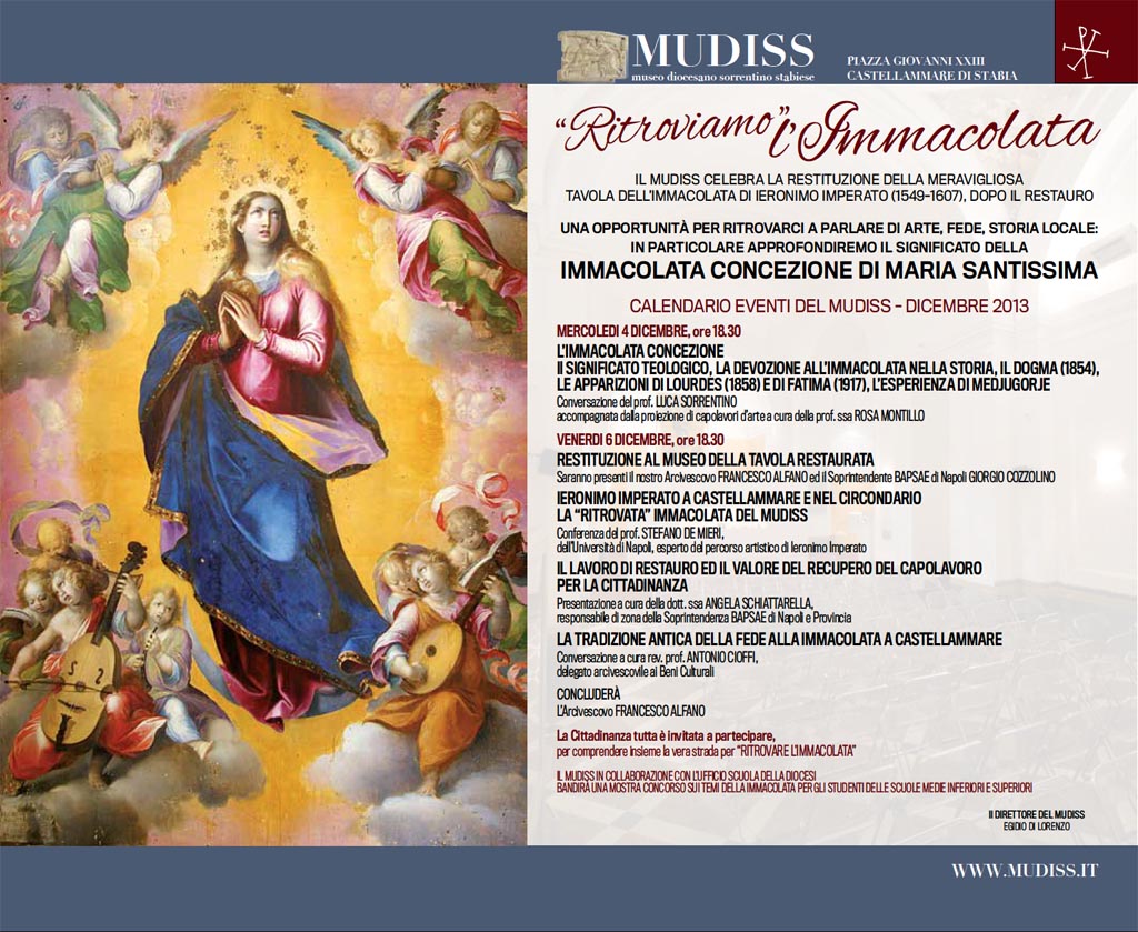 Un capolavoro di Ieronimo Imperato che viene restituito allo splendore originario, una occasione per ritrovare l’Immacolata in modo più coerente alla nostra educazione e sensibilità. Una opportunità che il Mudiss vuole cogliere per parlare insieme di fede, arte, storia locale, per approfondire il valore del dogma dellImmacolata Concezione di Maria Santissima, dichiara il direttore del Mudiss, Egidio Di Lorenzo. Come al solito, prosegue, con la condivisione dell’Ufficio scuola della diocesi, coinvolgeremo in una riflessione più approfondita i giovani delle scuole medie e superiori, che saranno interpreti di una mostra-concorso che prepareremo per il prossimo anno 2014.