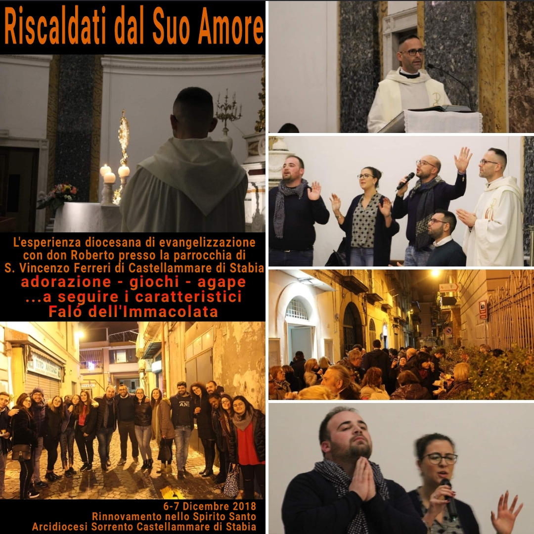 Giovedì 6 dicembre la diocesi di Sorrento- Castellammare di Stabia si è ritrovata presso la chiesa di San Vincenzo, in una zona centrale di Castellammare di Stabia. Dopo la partecipazione alla Santa messa, i giovani hanno invocato lo Spirito Santo per poter poi evangelizzare e invitare, con chitarra alla mano e muniti di volantini, per un altro appuntamento che si sarebbe tenuto la sera dopo. Il 7 dicembre infatti, la vigilia dell’immacolata, festa molto sentita in tutta la città, giovani e vecchi si sono riuniti in chiesa per un’ora di adorazione eucaristica, momento in cui la presenza di Gesù si è sentita in maniera forte. Dopo i giovani si sono spostati in un locale della chiesa dove li aspettava un ricco buffet preparato dalla parrocchia che li ospitava, il tutto coronato da musica natalizia. Dopo essersi rinfocillati e aver scambiato qualche chiacchiera hanno trascorso un’oretta insieme, dove si sono divertiti con giochi a squadre preparati dallequipe diocesana. Infine in tarda serata si sono avviati nei vari quartieri della città dove li aspettava il famoso “fucarazzo”, ovvero un grande falò fatto ardere a mezzanotte in onore della Madonna.
