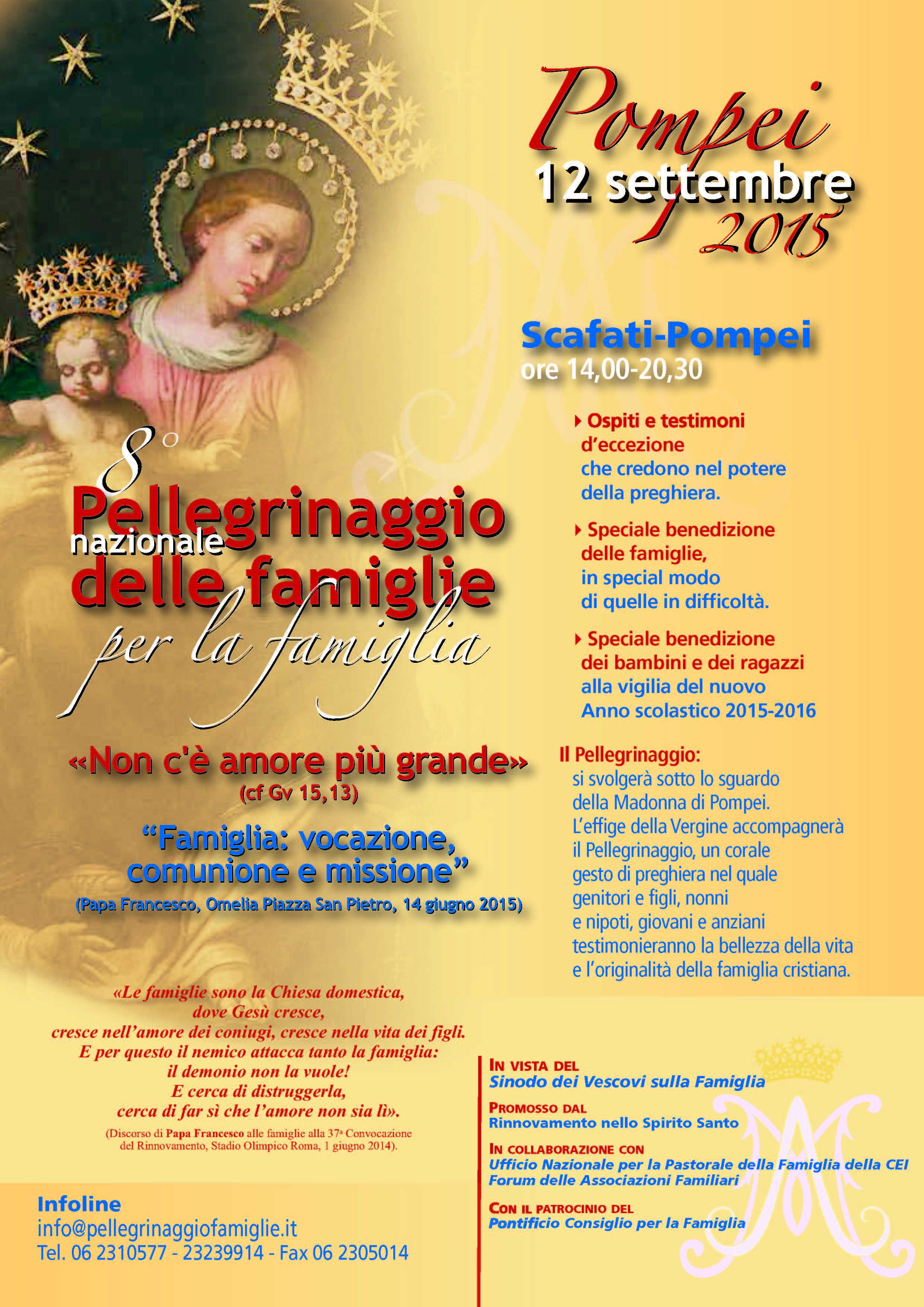 Il Pellegrinaggio di Pompei sarà anche l’occasione per prepararci alla grande Veglia di preghiera del 3 ottobre che si svolgerà in Piazza San Pietro, alla vigilia del Sinodo sulla Famiglia.