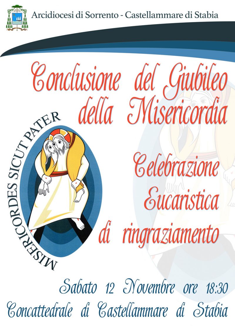 Sabato 12 novembre alle ore 18.30, presso la concattedrale di Castellammare di Stabia, vi sarà la celebrazione conclusiva dellanno giubilare con una Eucaristica per dire il nostro grazie a Dio. Presieduta dallArcivescovo Mons. Francesco Alfano, la celebrazione vedrà la presenza di tutte le parrocchie della diocesi per vivere insieme un momento di comunità e di preghiera sotto il segno della fede e della misericordia.