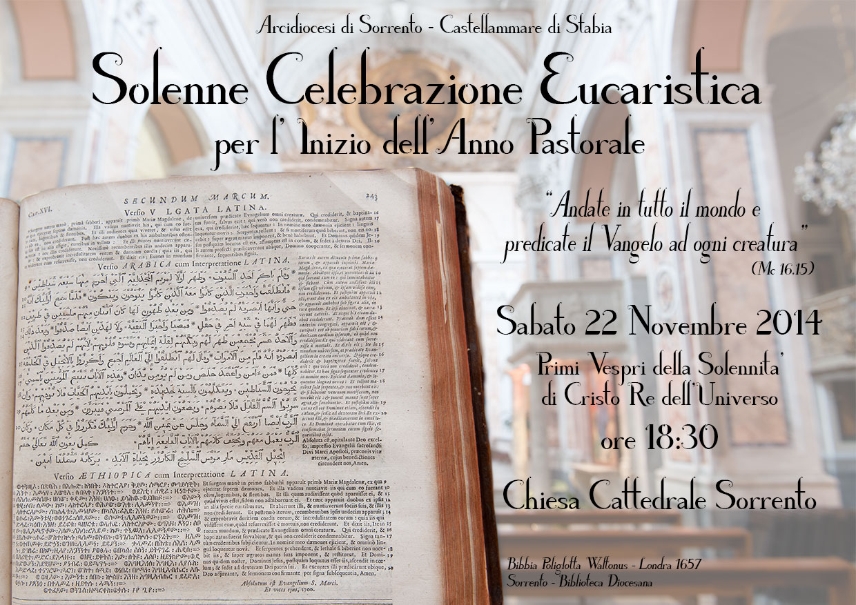 Sabato 22 novembre, ai Primi Vespri di Cristo Re, si terrà una solenne concelebrazione eucaristica, presieduta dal nostro arcivescovo, monsignor Francesco Alfano, nella cattedrale di Sorrento, alle ore 18,30, per lapertura del nuovo Anno pastorale.