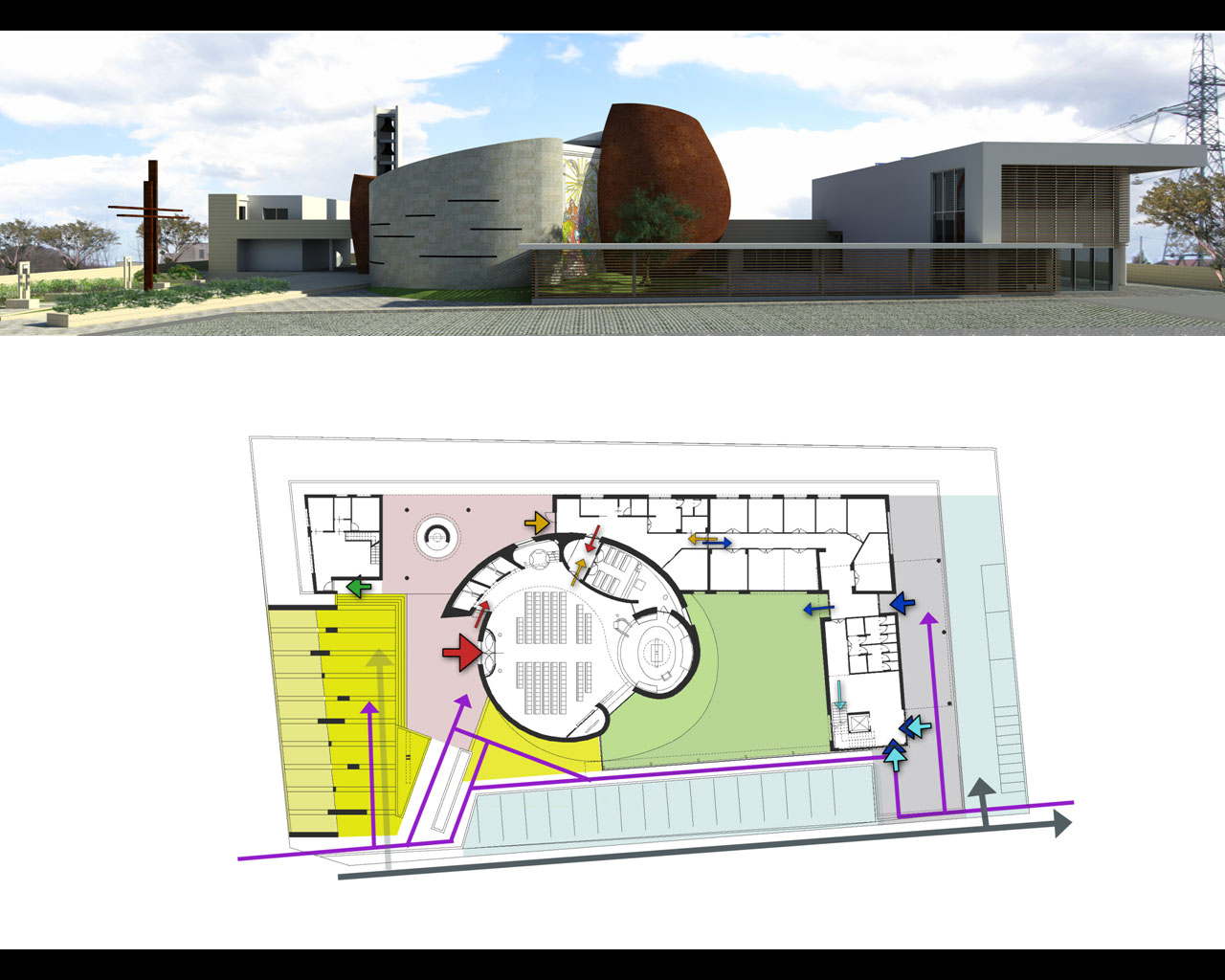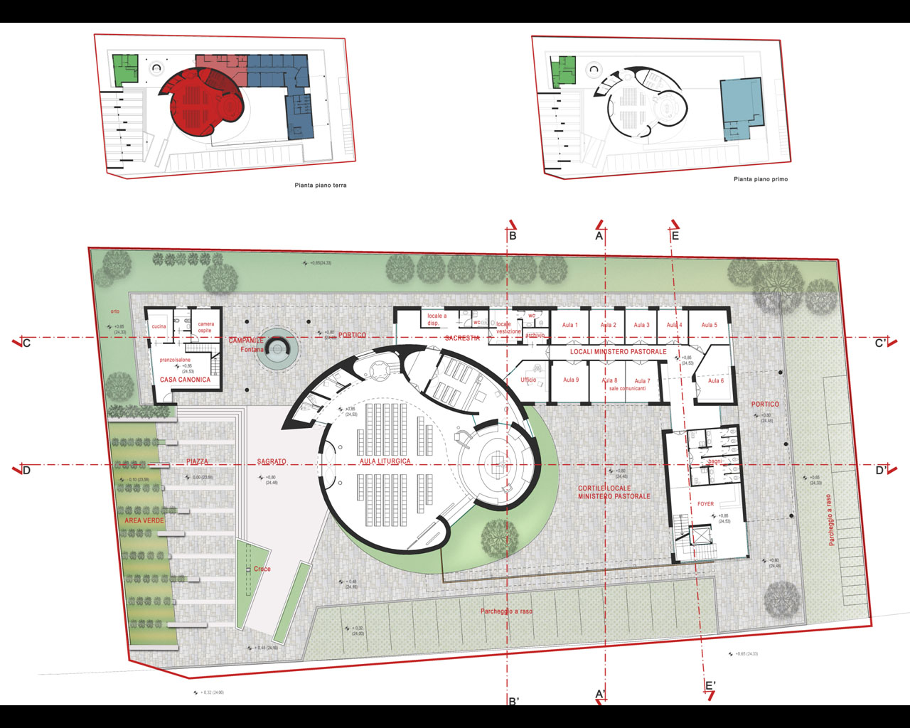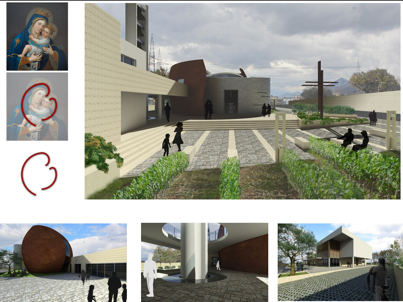 Queste le motivazioni che hanno determinato la scelta: “La Giuria riscontra nel progetto la capacità di imprimere un segno fortemente riconoscibile in un contesto anonimo, in cui viene introdotta una forza attrattiva e centripeta, pur nell’adeguato rapporto di distinzione e integrazione tra l’aula liturgica e le opere di ministero pastorale. La Giuria ha apprezzato l’orientamento dell’intero complesso secondo l’asse principale del lotto ovest-est; ciò consente di sviluppare i vari spazi nel verso di percorrenza della strada adiacente, dalla quale si fruisce di tutta l’articolazione dei pieni e dei vuoti. L’accesso al sagrato è immediato e centrale, tale da consentire la vista verso il Vesuvio dando la possibilità di godere di spazi aperti. L’architettura, pur caratterizzata da linee sinuose e fluide, ben identifica l’edificio di culto e la sua riconoscibilità. La Giuria ha apprezzato lo studio e la forte visibilità del campanile come elemento architettonico riconoscibile anche a distanza. Di grande interesse risulta l’uso attento della luce, l’articolazione delle strutture verticali e concave delle pareti che definiscono lo spazio interno senza racchiuderlo. Originale l’idea di partenza dell’intero progetto, ossia quella dell’abbraccio tra la Vergine e il Figlio che, in un certo modo vuole richiamare l’abbraccio della Chiesa-Madre nei confronti dei suoi figli identificati nella stessa comunità cristiana. Dal punto di vista liturgico, il progetto risponde in genere alle norme previste dai libri liturgici approvati dalla Santa Sede e a quelle menzionate dalla Nota pastorale della Cei “La progettazione di nuove chiese” del 1993. Gli elementi di forza del progetto sono inoltre: la giusta centralità dell’altare rispetto agli altri luoghi celebrativi; la buona correlazione tra i diversi poli (altare, ambone, sede e fonte); il rapporto tra fonte e penitenzieria, nonché la buona articolazione degli spazi e dei percorsi. Ogni luogo liturgico gode di una propria identità e dignità, pur in relazione con l’intera aula. Si apprezza inoltre la capacità della stessa di convergere l’intera assemblea attorno alla mensa dell’eucaristia e della parola. È stato apprezzato lo studio illuminotecnico, acustico e le soluzioni proposte per l’eco-sostenibilità del sistema, attraverso l’uso delle risorse energetiche da fonti rinnovabili (geotermica e fotovoltaica) in modo da ridurre notevolmente i costi di gestione del complesso parrocchiale. Infine una particolare menzione è data all’uso sapiente dei materiali favorendo quelli naturali e tradizionali del luogo”.