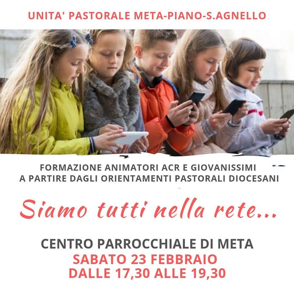 In virtù di ciò noi animatori, sia del settore ragazzi sia giovanissimi, nel contesto dell’approfondimento degli orientamenti pastorali diocesani, abbiamo preso parte al pomeriggio d’incontro, intitolato “Siamo tutti nella rete…”, tra le parrocchie dell’Unità pastorale 4 di Sant’Agnello, Piano di Sorrento e Meta riunite presso il centro parrocchiale di Meta il 23 febbraio; iniziando con un breve momento conviviale e dopo aver ascoltato ed intonato una delle preghiere più antiche ed intense della chiesa, l’invocazione allo Spirito Santo, il timore d’esporsi e le poche remore sono sfumati velocemente.