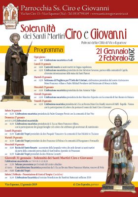 “La comunità vicana – dichiara il Parroco don Ciro Esposito – ogni anno celebra il ricordo dei martiri Ciro e Giovanni patroni principali della città di Vico Equense, avvenuto il 303 d.C. ad Alessandria d’Egitto. Quest’anno accogliendo le indicazioni dagli orientamenti pastorali con la gioia del Vangelo nella compagnia degli uomini, la nostra comunità vuole condividere la gioia della festa con Dio, con la famiglia e con le comunità circostanti, come si può vedere dal folto programma stilato. I santi Ciro e Giovanni hanno condiviso la gioia del Vangelo con i loro fratelli. Nella passio dei santi si legge che avendo saputo che quattro cristiane erano state arrestate, si recarono a Canopo, sobborgo di Alessandria, per incoraggiare a non venir meno nella fede. Furono però arrestati anch’essi e condannati a morte con le quattro cristiane. Il loro esempio – conclude il Parroco – ci sia da stimolo a condividere con i nostri fratelli la gioia del Vangelo”.