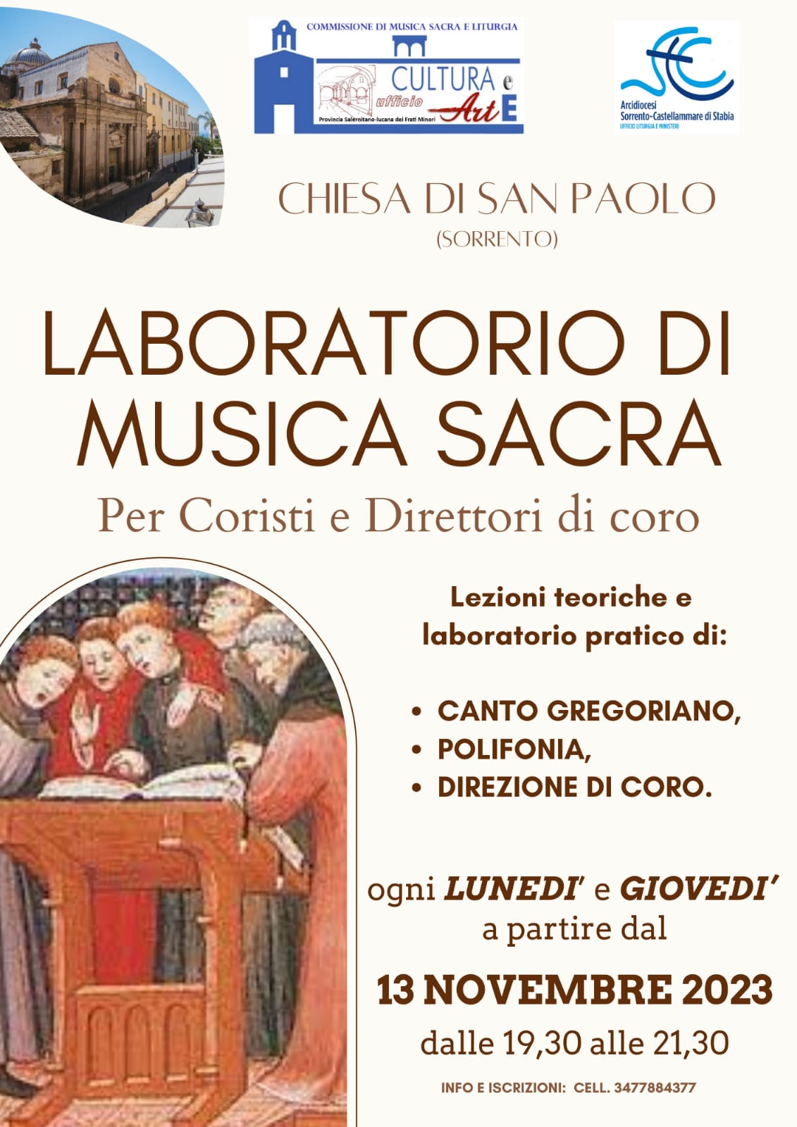 Per avvicinare alla musica sacra cantori e direttori di coro, ma anche operatori liturgico musicali, animatori del canto liturgico e tutti coloro con o senza una specifica formazione musicale, si è dato vita ad un laboratorio di musica sacra. Concepito come uno spazio di condivisione e di confronto in cui si viene accompagnati alla conoscenza della musica sacra, fornisce al contempo gli strumenti di base per apprendere gli elementi del linguaggio musicale di epoche, generi e compositori differenti.