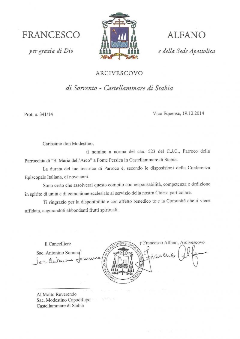 Don Modestino Capodilupo, in data 19 dicembre 2014, stato nominato parroco della parrocchia di Santa Maria dell'Arco a Ponte Persica, a Castellammare di Stabia. Read More