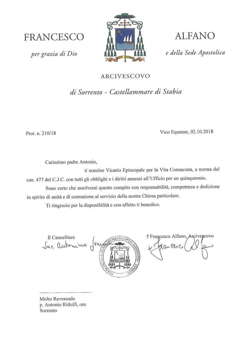 Padre Antonio Ridolfi, om, in data 02 ottobre 2018, è stato nominato Vicario Episcopale per la Vita Consacrata