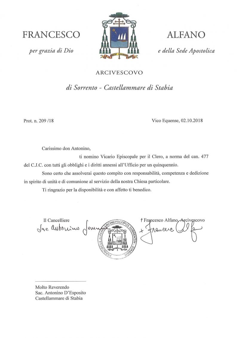 Don Antonino D’Esposito, in data 02 ottobre 2018, è stato nominato Vicario Episcopale per il Clero.