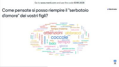 Un momento di gioco interattivo nel mezzo, ben organizzato attraverso un sito apposito, che coinvolgeva tutto il gruppone… Così sì che ci sentivamo uniti a tutti i genitori presenti, con i nostri dubbi, le nostre domande, i nostri punti fermi, i nostri valori.