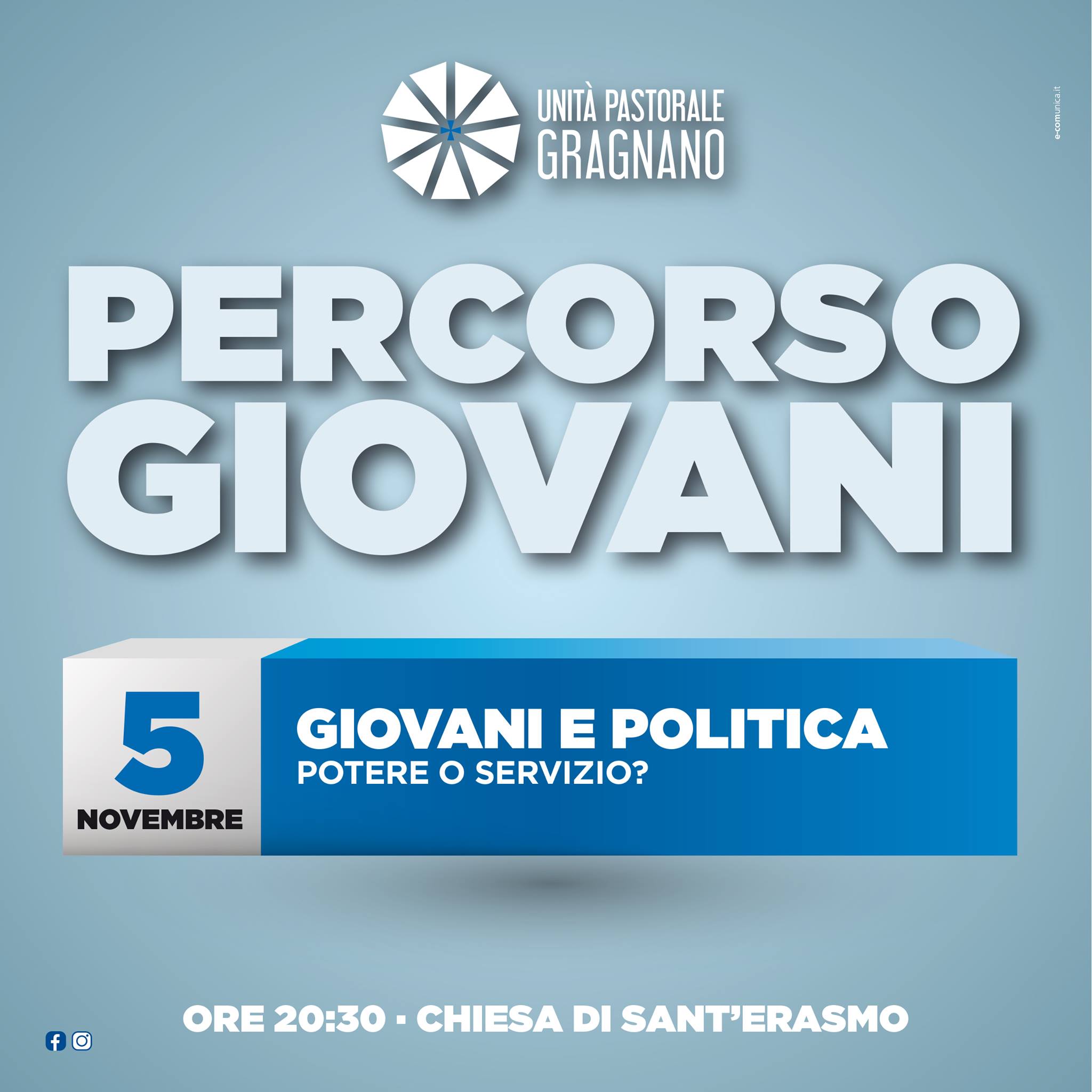 Il primo appuntamento è per venerdì 5 novembre, ore 20:30 a Sant’Erasmo, per parlate di “Giovani e Politica. Potere o Servizio?”