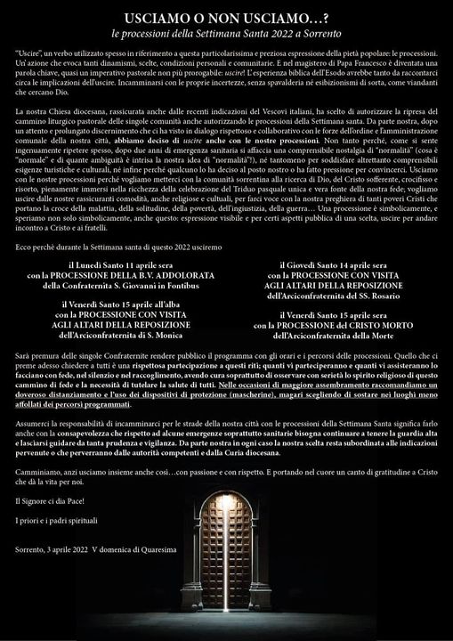 La nostra Chiesa diocesana, rassicurata anche dalle recenti indicazioni del Vescovi italiani, ha scelto di autorizzare la ripresa del cammino liturgico pastorale delle singole comunità anche autorizzando le processioni della Settimana santa. Da parte nostra, dopo un attento e prolungato discernimento che ci ha visto in dialogo rispettoso e collaborativo con le forze dell’ordine e l’amministrazione comunale della nostra città, abbiamo deciso di uscire anche con le nostre processioni. Non tanto perché, come si sente ingenuamente ripetere spesso, dopo due anni di emergenza sanitaria si affaccia una comprensibile nostalgia di “normalità” (cosa è “normale” e di quante ambiguità è intrisa la nostra idea di “normalità”!), né tantomeno per soddisfare altrettanto comprensibili esigenze turistiche e culturali, né infine perché qualcuno lo ha deciso al posto nostro o ha fatto pressione per convincerci. Usciamo con le nostre processioni perché vogliamo metterci con la comunità sorrentina alla ricerca di Dio, del Cristo sofferente, crocifisso e risorto, pienamente immersi nella ricchezza della celebrazione del Triduo pasquale unica e vera fonte della nostra fede; vogliamo uscire dalle nostre rassicuranti comodità, anche religiose e cultuali, per farci voce con la nostra preghiera di tanti poveri Cristi che portano la croce della malattia, della solitudine, della povertà, dell’ingiustizia, della guerra… Una processione è simbolicamente, e speriamo non solo simbolicamente, anche questo: espressione visibile e per certi aspetti pubblica di una scelta, uscire per andare incontro a Cristo e ai fratelli.