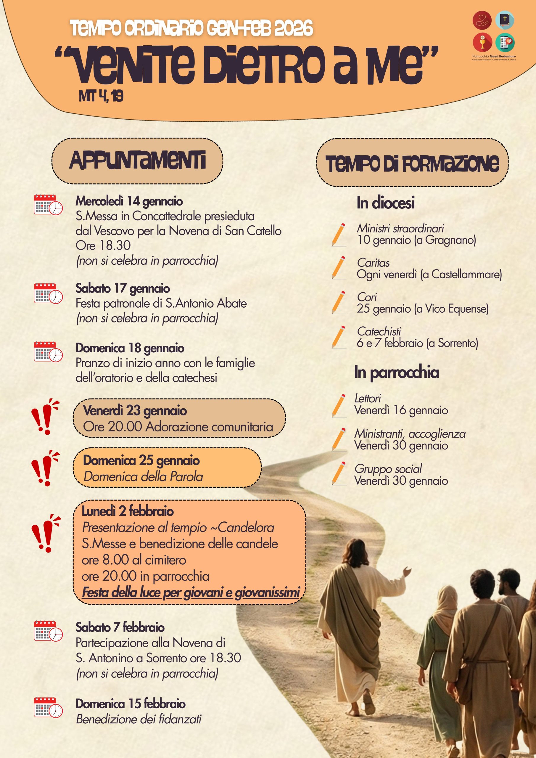Con l’inizio del 𝐓𝐞𝐦𝐩𝐨 𝐎𝐫𝐝𝐢𝐧𝐚𝐫𝐢𝐨 dei mesi di gennaio e febbraio 2026, la comunità parrocchiale si prepara a vivere un percorso scandito da appuntamenti liturgici, momenti di preghiera, iniziative comunitarie e occasioni di formazione, ispirati al tema evangelico “𝐕𝐞𝐧𝐢𝐭𝐞 𝐝𝐢𝐞𝐭𝐫𝐨 𝐚 𝐦𝐞” tratto dal 𝐕𝐚𝐧𝐠𝐞𝐥𝐨 𝐝𝐢 𝐌𝐚𝐭𝐭𝐞𝐨. Un invito che accompagna fedeli e operatori pastorali a rinnovare la sequela del Signore nella vita quotidiana e nel servizio ecclesiale.