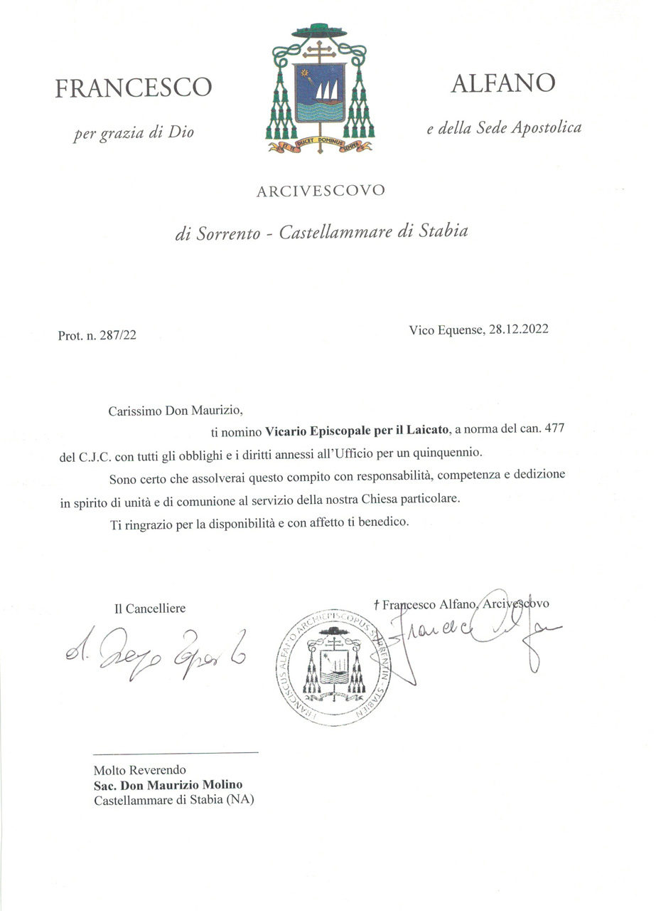 Don Maurizio Molino, in data 28 dicembre 2022, è stato nominato Vicario Episcopale per il Laicato.