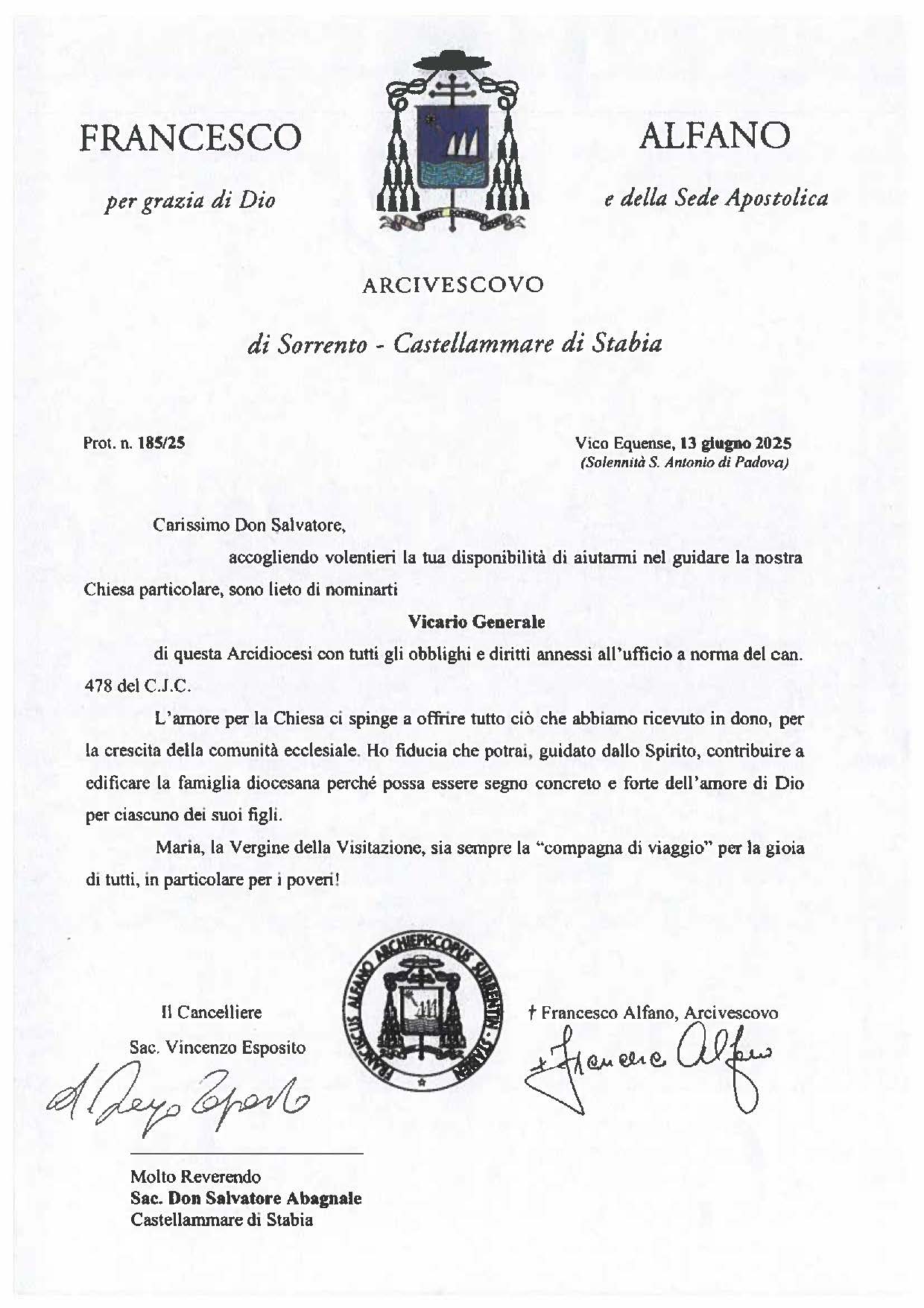 Don Salvatore Abagnale, in data 13 giugno 2025, è stato nominato Vicario Generale.