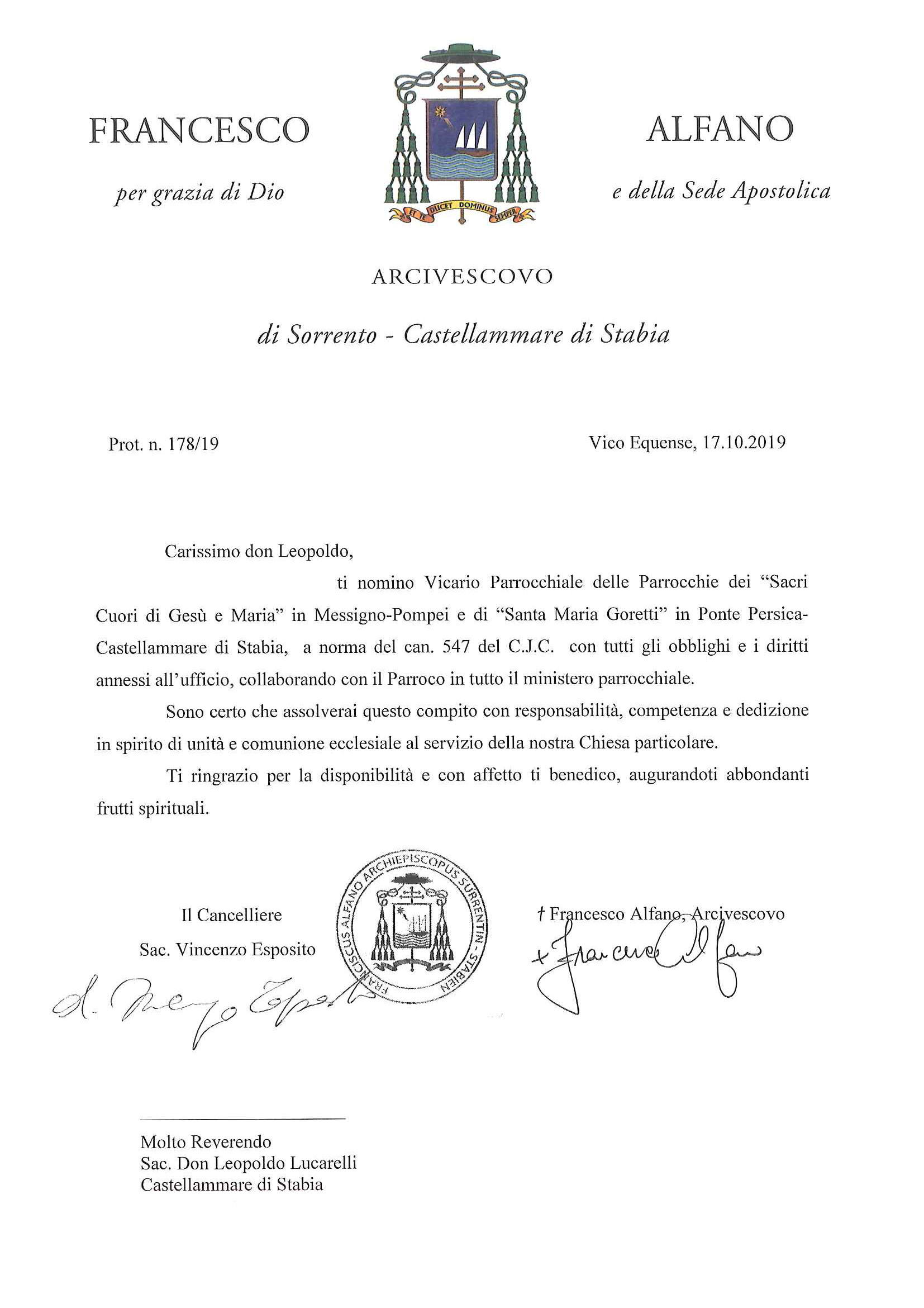 Don Leopoldo Lucarelli, in data 17 ottobre 2019, è stato nominato Vicario Parrocchiale delle parrocchie Sacri Cuori di Gesù e Maria in Messigno, Pompei e Santa Maria Goretti in Ponte Persica, Castellammare di Stabia.