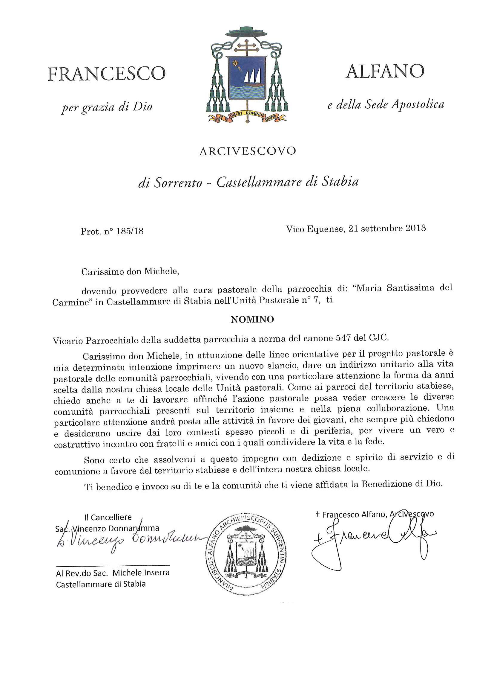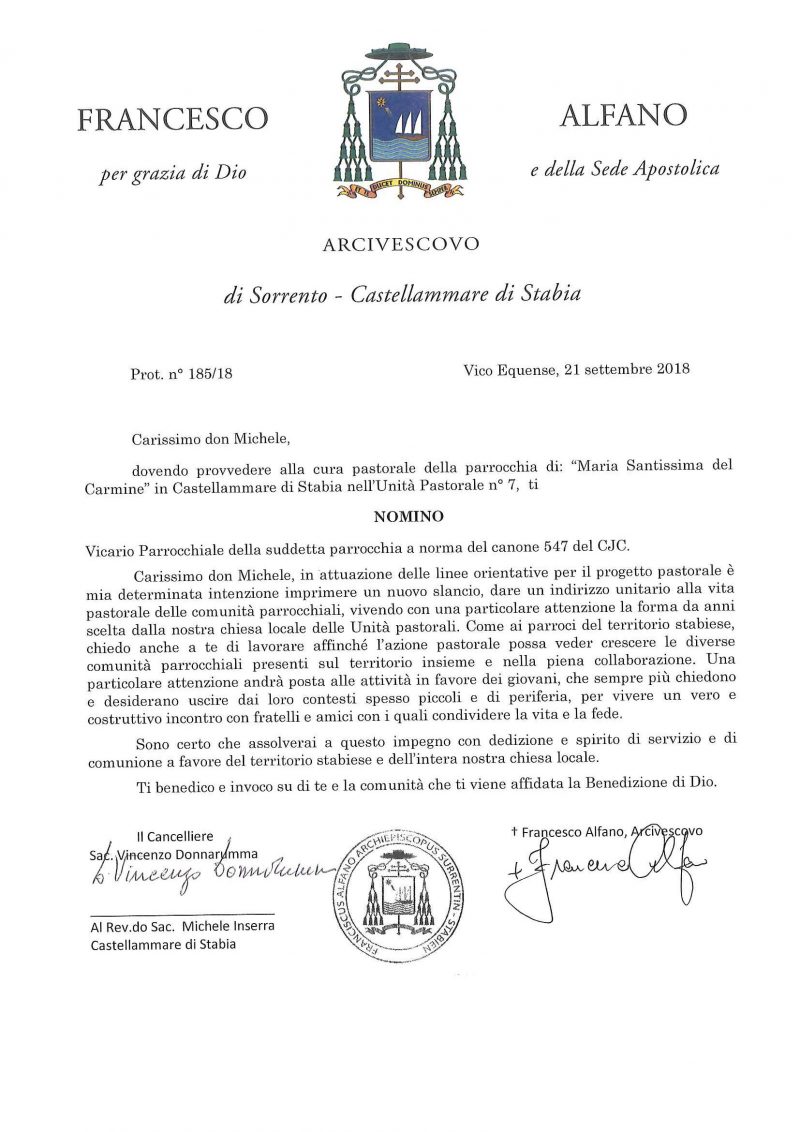 Don Michele Inserra, in data 21 settembre 2018, è stato nominato Vicario Parrocchiale per la parrocchia Maria Santissima del Carmine in Castellammare di Stabia.